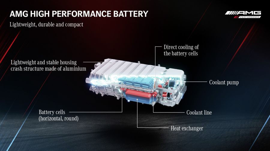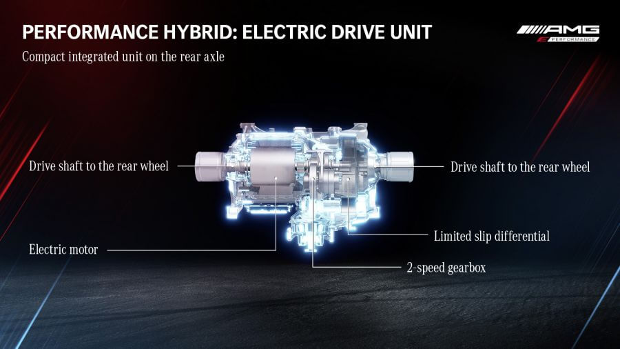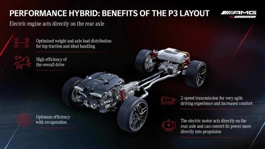 GT 63 S E Performance,整體來說它的最大進步重點就在於一套廠方命名為P3 Layout的全新動力架構,表面上看起來就像是你我熟悉的歐陸品牌PHEV插電式動力系統,多背上一組電池,並採用傳連在變速箱與引擎之間的碟型馬達。但實際上這套動力架構可說是一個全新的概念,這次賓士充分的將燃油引擎與電動車兩者融為一體,呈現出一個你泥中有我、我泥中有你的概念。這套系統可以很複雜也可以很簡單,我輩今天就先用比較簡單的方式來描述,4.0升V8雙渦輪引擎搭配9速MCT變速箱坐落在前軸,後軸上方則有一組6.1kWh容量的電池與峰值輸出200匹的電動馬達安排在後軸,並且也有一具兩速變速箱以及LSD限滑差速器可以對應加速與過彎需求;而廠方也公布電池重量為89公斤,雖然沒有公布馬達相關重量資料,但是TG推估兩者合併總重應該有利於廠方要做出與代號M177的V8引擎的209公斤之間的平衡配重。