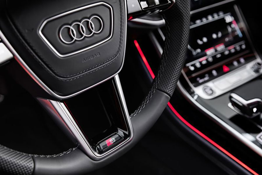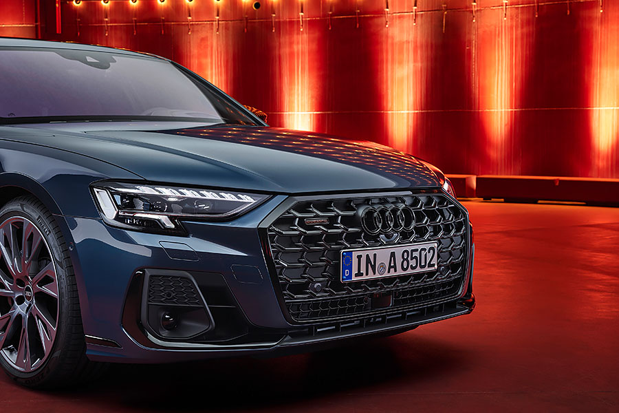 S-Class剛推出新車不久,寶馬大七的改款也箭在弦上,2018年出道的現行Audi A8也是時候做出一些改變來對應這兩位可敬對手。廠方也一改過去一直以來顯得較為素雅的外觀風格,這次直接把大面積水箱護罩的樣式改變得更精雕細琢,利用格狀的內部設計並特別在直、橫線條交界做出額外的亮面點陣狀的點綴處理,配著盾形護罩放寬底部面積,還有保桿上類似天枰的亮面飾條,算是在另外兩位對手改走樸素風格之時,增加自身搶眼的辨識特徵,同時短軸A8還會提供黑化外觀套件,會將前述彩亮面或鍍鉻處理的飾條改以黑色烤漆搭配,整體的視覺效果也別有一番風味。另外新車也增加了五種消光色塗裝提供車主選配。