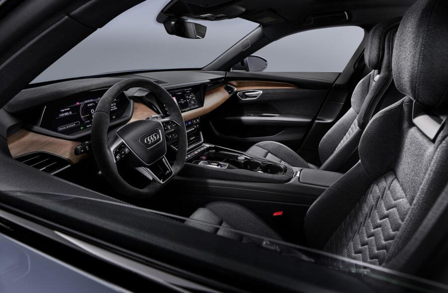 進入Audi e-tron GT 車室,其兼顧運動化取向與舒適駕乘空間的雙重特質,座艙設計為駕駛導向,駕駛前方搭載Audi全數位虛擬座艙plus,可選擇經典、運動化或e-tron Sport等三種駕駛介面,中控螢幕亦採駕駛導向,藉由中控台橫向線條延展,搭配高質感飾板與具深度的立體懸浮感設計,營造富科技質感、運動化的座艙氛圍。乘坐時,後座腿部空間採用地窖設計,巧妙避開設在底盤位置的電池模組,結合全景式玻璃車頂,給予車內乘員更寬闊的乘坐空間,同時車內搭載Bang & Olufsen 3D環繞音響系統,針對行李裝載機能同樣相當完備,包含擁有85 公升置物容積的前行李廂與350公升裝載空間的後行李廂,不論短程行駛或長途旅行,皆提供如五星級座艙寬敞舒適的頂級乘坐饗宴。