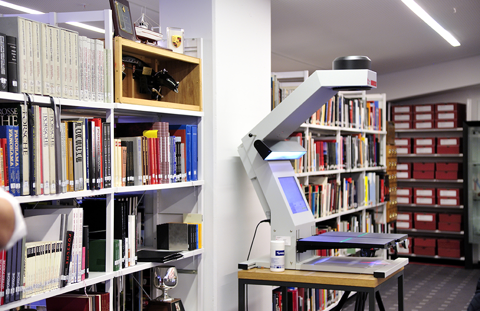 隔著一道玻璃窗之外的民眾用羨慕神情看著我們,只差沒流下口水,這時記憶中只能從模型、網路圖片與書籍才得以欣賞的歷史文物活生生就在眼前,可以摸也能開車門,完全不用擔心保安的警棍與電擊棒,917 k Martini、550 Spyder、718 Coupe,還有如玩具車般上下疊放的964 RS、997 GT3 RS與993 Turbo,這裡是位於入口處後方的車輛整備區,跟917 k合照是一定要的,爽完後又被帶到另一個樓層,某個小房間的門一開發現別有洞天,這裡存放大量歷年來關於Porsche產品的相關書籍與資料,是行家才會知道的隱藏版品牌圖書館,且據工作人員表示這裡有條件對外開放,只要向館方提出申請並獲得許可就能進入閱讀查詢。