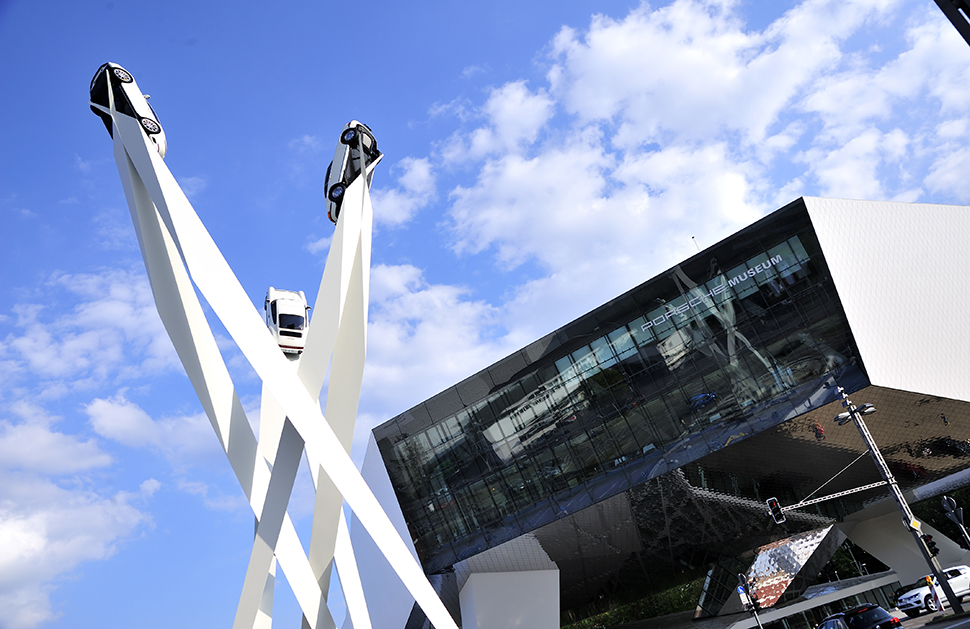 在TG造訪的前兩天,博物館前圓環中心的Inspiration 911雕塑才剛正式落成,三根長24公尺的鋼柱分別各矗立著一部911(911/930/991),這巨型雕塑除了向該車系超過50年的光輝歷史致敬,也意謂將成為祖文豪森的新地標。走進這棟宏偉建築的每個人臉上都帶著興奮神情,我們也不例外,只是當大家依序踩上那即將帶你進入故事序章的時光機(手扶梯)那一刻,工作人員卻帶著我們走進一道側門,這裡是禁區?我發問,是的,只有VIP才能進到這裡。