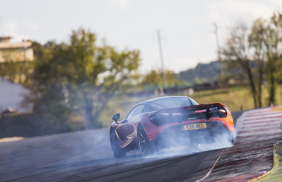 接著小羅讓我使用Track模式,Pit前的直線已排到四檔,微微左拐時已切入五檔,這時我信心大壯,反而小羅似乎有些緊張的不時將手放在褲子上擦手汗,這時車速約210km/h,前方的小角度高速右彎喚起先前在鄉間小徑的手感,油門收一點點然後雙手輕握方向盤稍微一推一拉,順著路肩的白色弧線走,接著再油門到底對準Cimini 1彎直衝,這時你問我會緊張嗎?一點都不,720S的底盤真如老樹盤根,不管路線如何左右擺動,輪胎依舊緊緊咬住路面,某一圈在速度最快的Campagnano彎前我犯了一個錯,240km/h踩下煞車後的五退四沒想到手一滑沒退到檔,晚了約兩秒才硬退到三檔,不過煞車回饋的訊息顯示仍有餘裕,時速200km/h到完全煞停只需4.6秒的能耐果然不假,甚至連小羅都沒發現,還直跟我說這車很厲害對不對,這時我只有笑而不答,因為怕說出真相後他的手汗可能噴發的更厲害。