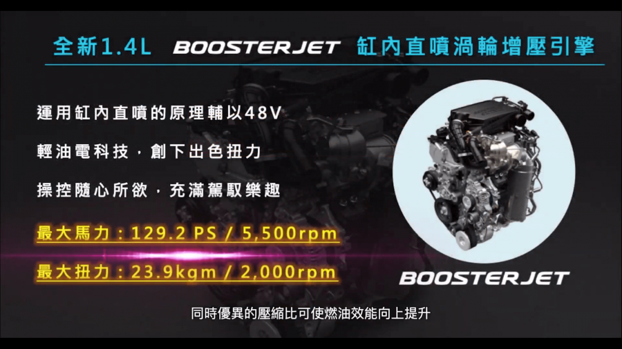這套SHVS(Smart Hybrid Vehicle by SUZUKI)智能混合動力,透過48V ISG 整合式啟動馬達發電機,可減輕引擎在起步及加速時的負擔,兼具明快的動力反應及順暢性,也提供更加優異的油耗數字。此外,1.4升BOOSTERJET缸內直噴渦輪增壓引擎受益於48V複合動力系統的輔助,近乎感受不到渦輪遲滯,更創下23.9kgm/2,000rpm的扭力,展現小排量大功率輸出,前驅S款更創造19.3km/L的低油耗數字。