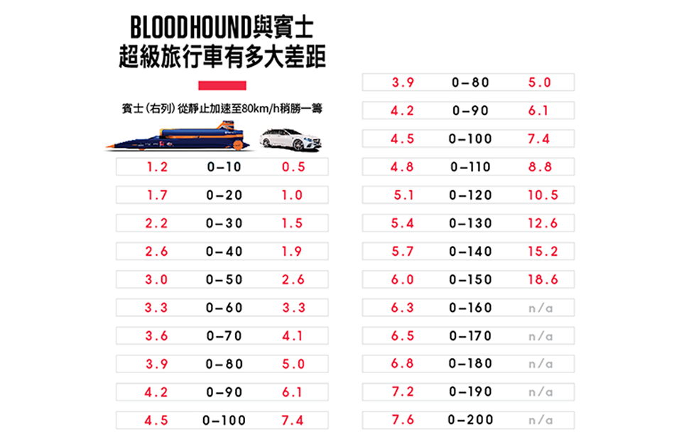 Bloodhound的絕技果然厲害。儘管相距數百碼,你仍然可以清晰聽到噴射引擎催動內勁,車尾噴氣流令背景事物化作一片模糊,起跑一刻好不淡定。一待後燃器點火,這個重達五公噸的鬼見愁便如箭脫弦飛彈而去,加起速來完全不像世上其它人造物,速度簡直以幾何幅度暴增,相對於3.3秒完成0-96km/h加速,96-193km/h不外乎1.8秒,193-290km/h亦只消1.7秒,一字記之曰狂。E63S旅行車從靜止加速至96km/h,時間跟Bloodhound不分軒輊,但縱有這股足以威脅超跑的短途衝刺威力,在Bloodhound面前仍然不得不俯首稱臣。