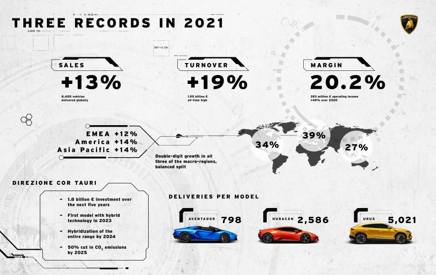 這一年的銷量也打破過往的紀錄,在全球共交付8,405輛新車(較2020年增加13%)。當然有三個區域出現兩位數成長,美國為+14%、亞太+14%和EMEA(歐洲、中東和非洲)+12%。銷量方面以美國為大市場,共售出2,472 輛(+11%),其次是中國的935輛(+55%),德國706輛(+16%)和英國564輛(+9%),義大利本地市場則增長+4%,共交出359輛新車。車種別方面,最大宗的當然就是Urus,高達5,021輛,其次是V10動力的Huracan,在Huracán STO的強勁推動下增長至2,586輛,再來是Aventadors的798輛。