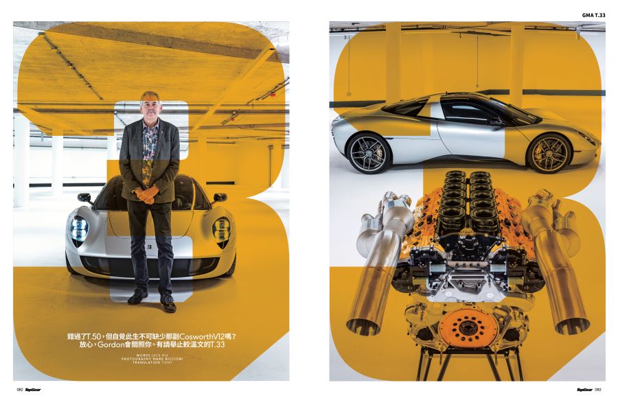 不過達成上述目標之前,Gordon尚有另一大計,一個與T.50同聲同氣由同一位類比奶媽養大,自然進氣V12同樣不靠電氣輔助,外形同樣滑似肥皂,但另有一副獨特個性的超跑胞弟。這位胞弟叫T.33,是GMA成立以來的第二款全新中置引擎超跑。T.50今後仍然是GMA打響招牌的代表作,T.33則較為傾向悠閒寫意,並採用座椅並排的傳統雙座格式,套用Gordon的說法就是「一款個性上較為講究舒適寫意、性能發揮毫不費勁和日常使用性的汽車」。