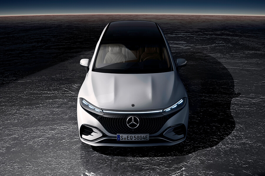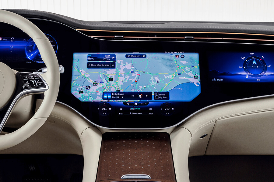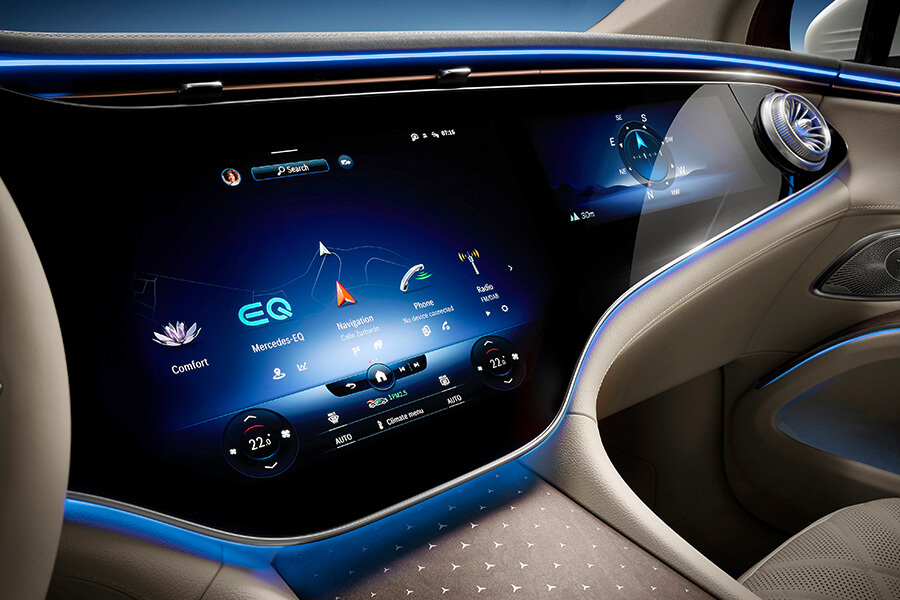 既奢華又前衛的內裝鋪陳包含了橫跨兩根A柱的大型彎曲螢幕MBUX Hyperscreen。這組由三具螢幕及其共同的蓋板玻璃所構成的巨型螢幕不僅得以驅動車內的杜比全景聲音響系統,為車內創造360度的聆賞體驗外,所搭配的MBUX多媒體系統更借助AI人工智慧,能適應駕駛者並隨之發展出個人特色;其中的智慧導航系統更能協助規劃最快、最方便的路線,並將充電行程納入計算、同時對交通壅塞或駕駛方式的變化做出即時反應, MBUX 系統也將顯示電池的充電狀態是否足以在不充電的情況下返航。在路線計算中,駕駛也可自行手動添加沿途的充電站、並排除原先規劃的充電站,同時估算出每個充電站所相對具備的充電成本。