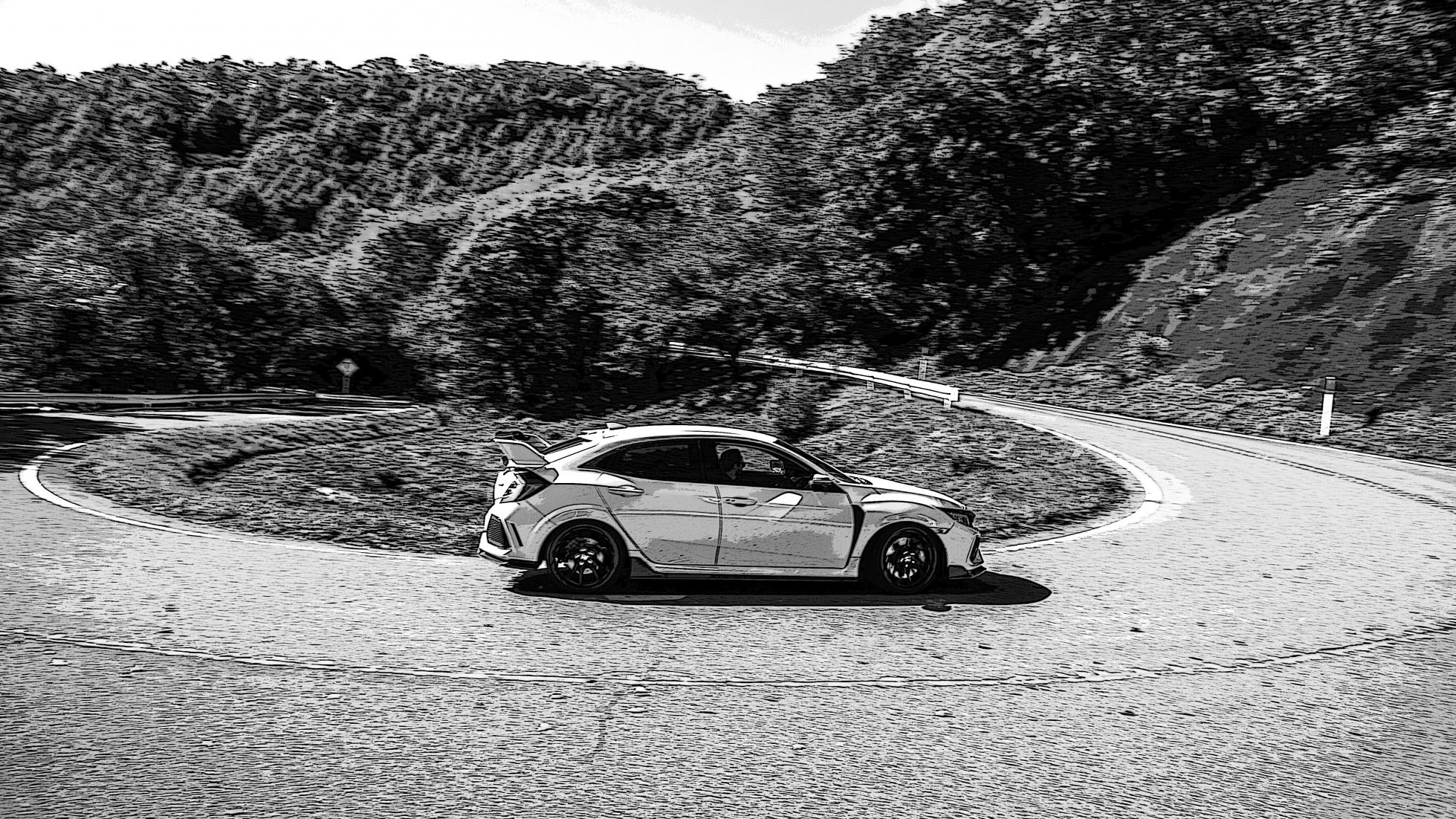 這一程夜車應該沒有甚麼驚喜,加上距離不短,正好讓我們靜靜沉思。事實卻證明群馬縣原來不甘平凡,所以我們此刻才會在120號公路的髮夾彎和相對高速的直路之間靠著頭燈50尺的照射距離,在四周一片漆黑的情況下風馳電掣。其中有一個彎(或者說是某一類彎)恰好概括了Type R用甚麼妙法支配道路。那是一個向外傾的濕滑髮夾彎,彎道兩旁還堆積了好些落葉,按理說應該是觸發轉向不足大災難的最佳條件,Type R的前輪卻總是有辦法找到牽引餘地,不屈不撓地鎖定轉向弧度;激發車手信心莫若於此。