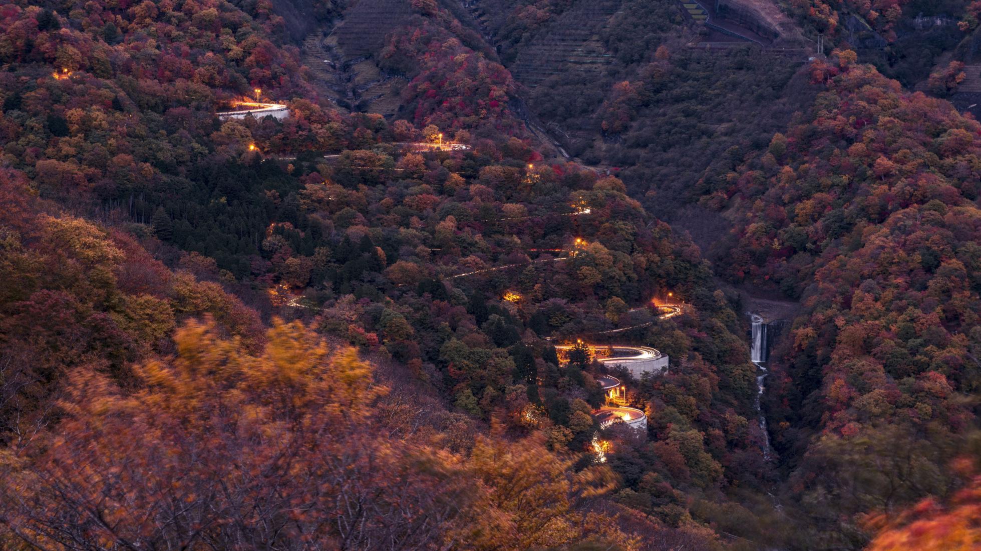 山道最高處有一個小鎮,由此開始便是下坡回程路。很可惜修路工程導致交通相當擠塞,加上觀光巴士為數不少,所以在較陡斜和急遽的髮夾彎,車輛只能用步行速度魚貫而行。不過這樣一來,我們倒是有大量時間好好欣賞山谷下面的滾滾樹海。雖然距離櫻花綻放的季節尚遠,滿山紅葉和枯葉亦不失為一大雅事。之後天色很快便轉暗,夜幕之下自然沒有甚麼風光可賞,也是時候奔往兩個小時車程外的正宗日式旅館好好休息,以便翌日早上用最佳狀態直搗第二個目的地。