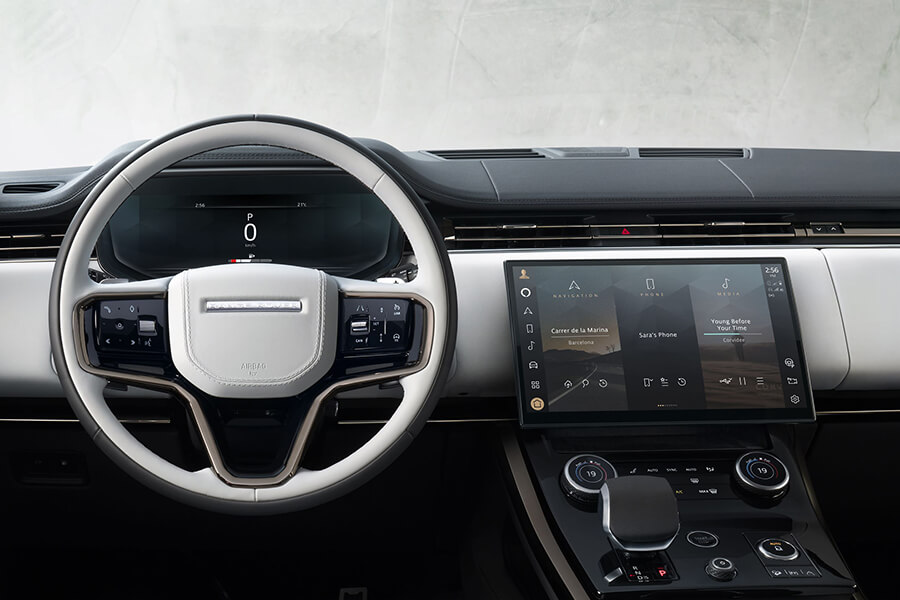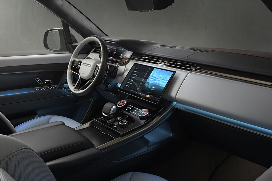 New Range Rover Sport 的簡約設計延伸到其全新的內裝,其特色是標誌性的 Range Rover 指揮官駕駛座椅與最新技術、最好的材料結合在一起,在追求優雅和內心的渴望之間取得了完美的平衡。如同飛機駕駛艙的駕駛座提供了出色的視野,為動態駕駛體驗奠定了基礎,同時大角度傾斜的中控台和直覺的科技體驗提供了更便捷的駕馭體驗。而透過創新且永續的Ultrafabrics™ 優質紡織材質,並採迷人的全新 Duo Tone 配色,同時還提供延伸至儀表板和車門細節的獨特紡織材質選項。同時內裝更提供包括奢華的粒面皮革、溫莎皮革或柔軟的半苯胺皮革等可供選擇。而這些頂級面料與新的Moonlight Chrome 內飾相互融合,而與 Meridian 共同開發並隱藏在後尾門內的音響等元素更營造簡約而現代的美感。