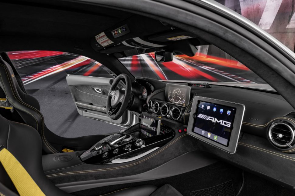 最讓人好奇的應該就是內裝了,這次AMG也大方公布了內裝照片,兩張賽車桶椅及防滾架是基本配備,另外在原有的單一螢幕之外,還多設置了一個螢幕及副駕專用的平板電腦,另外免不了的就是通訊設備,在後行李廂可以見到無線電通訊主機及電力管理系統,讓前導車駕駛可以跟賽事主控官及裁判之間保持密切連繫,以維持賽事的順利進行並因應可能發生的所有狀況。