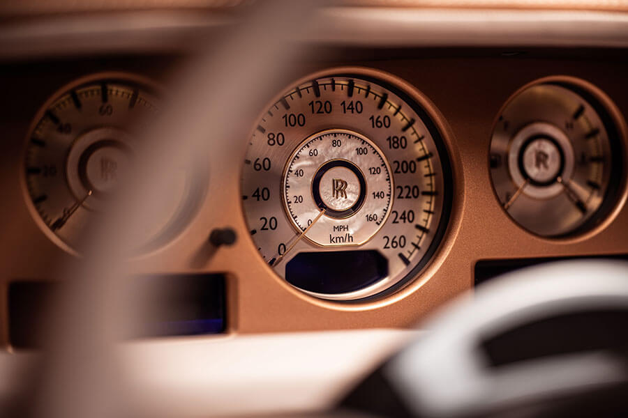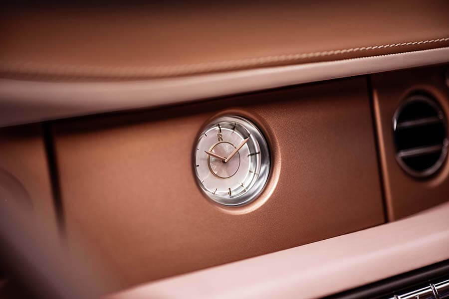 此車車漆的顏色靈感來自買家最喜歡的珍珠貝殼,中控上所鑲嵌著的珍珠母也使外觀顯得格外別緻。此外控台中央的鐘錶更來自買家自己的收藏,配色與質感皆與車身內外相呼應。
