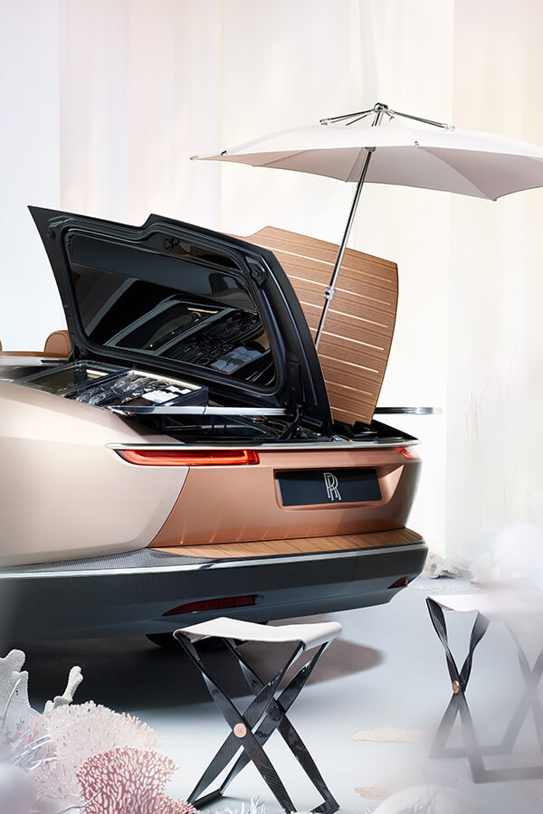 當然這部Boat Tail所具備的技術工藝絕對不凡:除了在車色調製方面便由客戶在收藏中挑出四種珍珠予勞斯萊斯客製設計部門做為參考,前格柵則是由一塊巨大的鋁塊銑削而成。勞斯萊斯的老闆 Torsten Müller-Ötvös 將此車製造工作描述為“汽車中的高級時裝”。在車輛修長的後半部覆有皇家胡桃木飾面,並鑲嵌有緞面拉絲處理的鍍玫瑰金細條紋,並且具備兩個可對開的中央艙們,在由胡桃木綴飾的內部空間中有著一套漂亮的野餐組:桌椅、餐盤及餐具一應俱全,甚至為買家附上了遮陽傘。