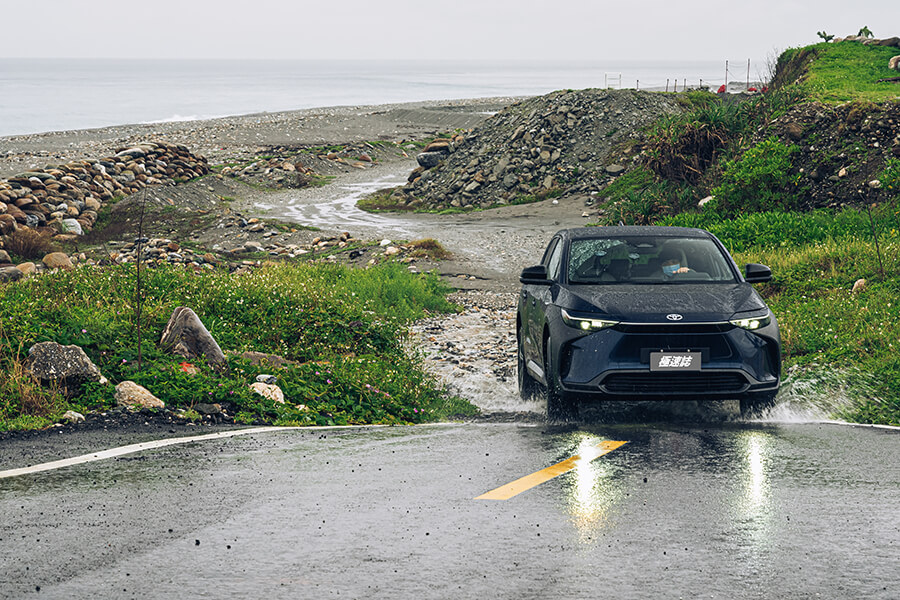 因為雨勢的關係,整條路空蕩蕩,就像特地為我封路似的,那就來吧。作為豐田純電戰略的第一 款新作,採用專屬eTNGA平台的bZ4X算是相當新鮮且有趣的產品,不過就駕馭來說,其實有點枯燥乏味,車上沒有Sport模式也沒有其它跟性能相關的選項,一腳電門到底的加速過程毫無情感可言,聽不見刻意增添戲劇性的聲浪或有人從背後踹你一腳的猛烈推力,不過近兩噸的車身進出彎心的動作還 算機靈,爪勁也在水準之上,不過你應該知道,面對如此曲折彎角和忽明忽暗的迂迴道路,加上惡劣的雨勢,有可能轉瞬間便陷入水坑及落石構成的陷阱, 在旁人眼中我居然駕著這樣一部毫無個性可言的純電休旅車飛馳,根本是一種瘋癲且荒唐兼而有之的行為,當然,比起依照50km/h的速限慢慢走,可能是快了一些些沒錯啦,但遇到這種鬼天氣,應該沒有人會想要多作停留……。