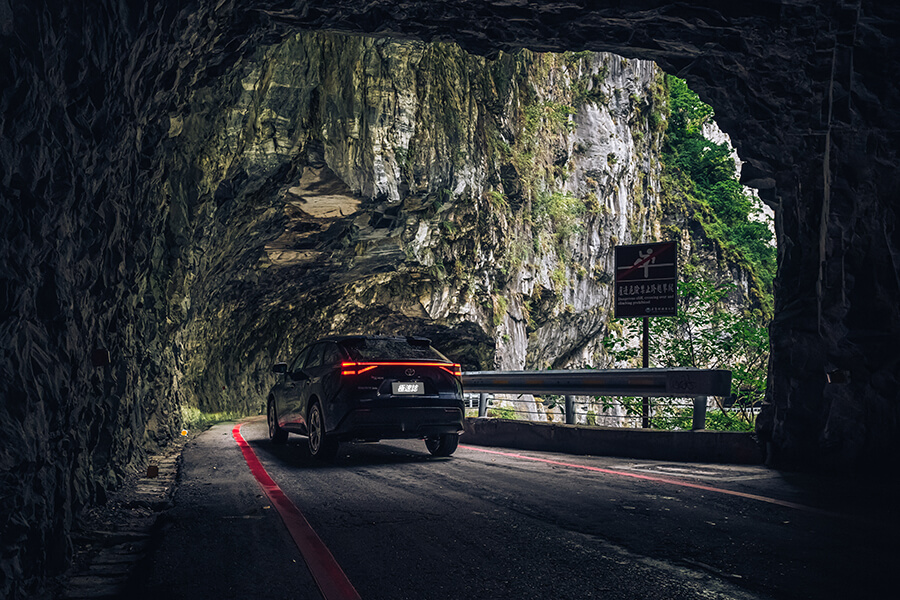 這部豐田確實相貌堂堂,內涵亦時髦得體,造工扎實令人安心,加上空間寬敞,確實可以坐上五位大人及隨身行李一起上路,除了底盤傳來的些微滾動噪音之外,風切聲及震動抑制都有相當高的水準演出,至於電力系統更不用說囉,一路不出聲但隨時聽命行事。在通往花蓮的漫漫長隧道中,有一項特別值得讚賞就是TSS 3.0,這次它終於懂得如何走在中線上了,相較於過去要轉不轉、飄忽不定,這次終於乖乖走在車道正中央,讓你可以安心的使用車上一些跟開車無關的娛樂功能,平心靜氣挑一首好音樂,再舉止優雅的打開零食並送進嘴裡的同時,我的視線焦點又再度聚焦可行駛里程上,儘管廠方公布的556km(WLTC)最大續航里程跟出發時儀錶的310公里落差頗大,但一路到花蓮崇德卻只用掉 1/3的電力,讓我不再緊張兮兮,而且此刻天氣居然放晴了,眼看時間還夠,不如衝一趟太魯閣吧…… 我在開玩笑嗎?沒有哦,真的一路殺到天祥,而且沿途交會的車輛寥寥可數,就算開進向來人聲鼎沸的燕子口,我很難相信眼前的景色,居然空無一人,真應了一句來的早不如來的巧。此時攝影師Jackal樂的手舞足蹈,相機快門完全停不下來……照理說我們可以提前收工的,但沒想到車上的電力相當管用,表現如倒吃甘蔗般漸入佳境,即便數字愈來愈低,但過程 相當穩定,更不會出現如跳水般的跌幅,而且打開動能回收鍵的話,甚至還可以讓電力多撐一段時間,只要可以管好你的右腳,而且即便在最省電的Eco模式時,它的加速反應仍相當活潑,讓你可以完全信任。
