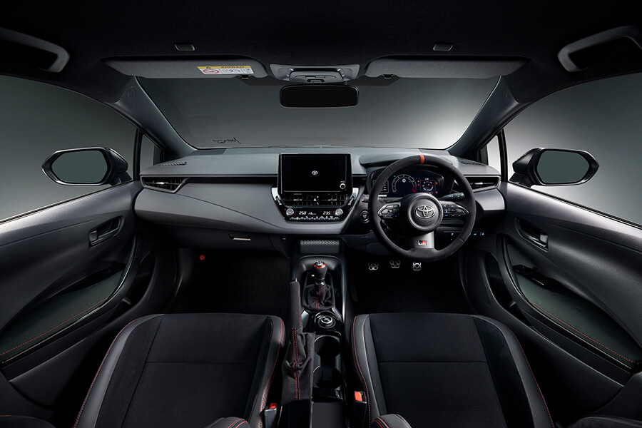 在內裝部分GR Corolla Morizo Edition的座艙同時也進行了一些更動。首先是車門把手、方向盤等處皆以黑色Brin Naub絨面革和紅色車縫線營造熱血感受;該車的座椅上還有著GR字樣刺繡,方向盤同時也以用絨面革包覆。而有趣的是每台GR Corolla Morizo Edition在前檔風玻璃處皆有著Morizo簽名字樣。