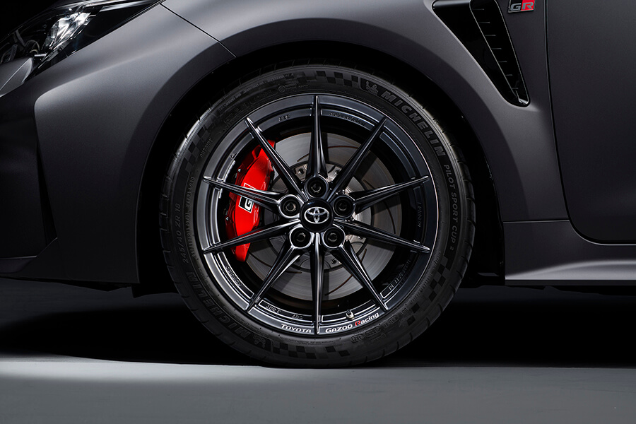 同樣配備了1.6 升三缸渦輪增壓引擎,GR Corolla Morizo Edition從標準版可提供的300匹馬力及37.7kgm的扭利,經過調整後則將扭力提升至40.7kgm。隨著扭力增加所同時伴隨而來的是一系列輕量化工程,使MORIZO 版本的重量比一般版本輕了近45 公斤。從那些地方偷輕?Morizo桑這下直接把後排座椅給拆了,因此後排音響與後窗開關也順便一併移除,乃至於後雨刷及雨刷馬達、甚至在尺寸升級為245/40的Michelin Pilot Sport Cup 2配胎中18吋十輻鍛造輪框也進行了輕量化工程。此外包含鍛造碳纖維車頂、鋁製引擎蓋和鋁製前門板皆在輕量化之列。同時還一併換上了新的前煞車油管。