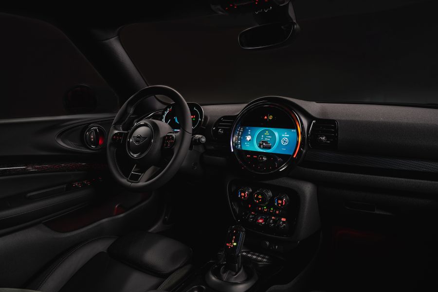 MINI Shadow Edition座艙空間同樣以黑色視覺打造內外一致黑化的純粹個性,黑色Cross Punch真皮內裝的菱格紋呼應Shadow Edition專屬設計圖樣,搭配黑色Nappa跑車式真皮方向盤,不僅充分展現Shadow Edition的黑色靈魂,更帶來絕佳的操控手感與乘坐舒適感。抬頭望向車內頂篷,細節處仍舊必須秉持極黑精神,無論是頂篷、遮陽板、車頂把手或A.B.C柱皆採黑色處理,完美打造純黑座艙。夜幕降臨、引擎啟動之時,純黑座艙搭配可變幻多樣色彩的環艙氣氛燈,於黑色高光澤內裝飾板(Clubman)、中央螢幕、車門內側等多處透出個性化色彩,更加突顯MINI隨心且獨特的座艙氛圍。