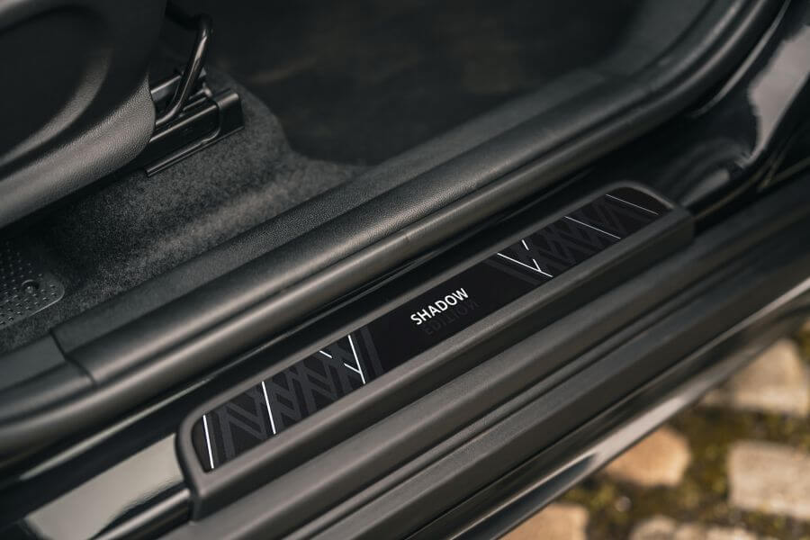開啟車門,擁有菱格紋圖樣設計的Shadow Edition專屬迎賓門檻隨即迎接車主與乘客進入座艙空間,率先為即將展開的個性旅程增添一抹儀式感;副駕駛座前方的Piano Black內裝飾板上,同樣以Shadow Edition專屬徽飾點綴,再再展現Shadow Edition對細節的極致追求。