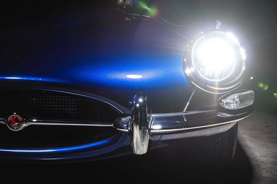經過改造後的E-Type Roadster外觀上依然保持著當年的模樣,閃亮的鍍鉻保險桿加上鋼絲輪框也依然配備其上,不同的是照明燈具已改為LED燈組。車漆雖不是經典的英國賽車綠,不過此車身披的塗裝可是源自英國國旗上的藍色;在開篷時則可以看見從英國著名的郵筒紅色作為靈感的手工製作內裝皮革。