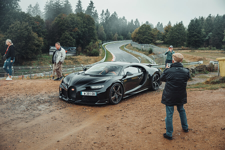 Autobahn滿分過關,也是時候兜兜圈,老天卻在紐伯靈映入眼簾時開始十分熱心地潤澤大地。天有不測風雲,十分正常;有人在滂沱大雨中用一部Bugatti玩Touristenfahrten可就不太正常了。無怪乎在場的超跑追星族馬上傾巢而出,其中一位出奇貌似史瑞克的仁兄更在接下來三個小時跟屁蟲一樣跟著我們。