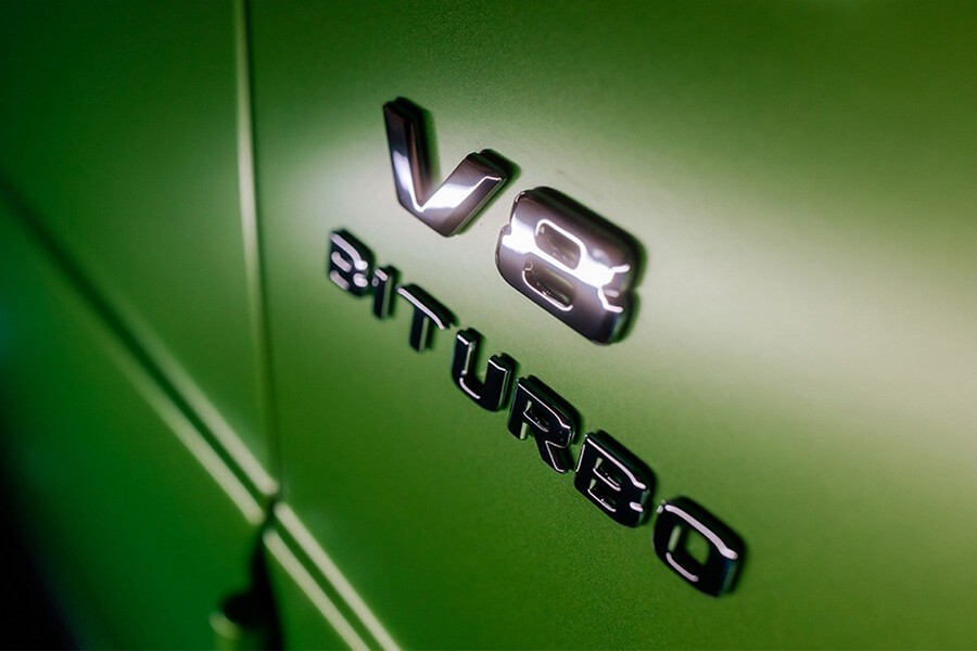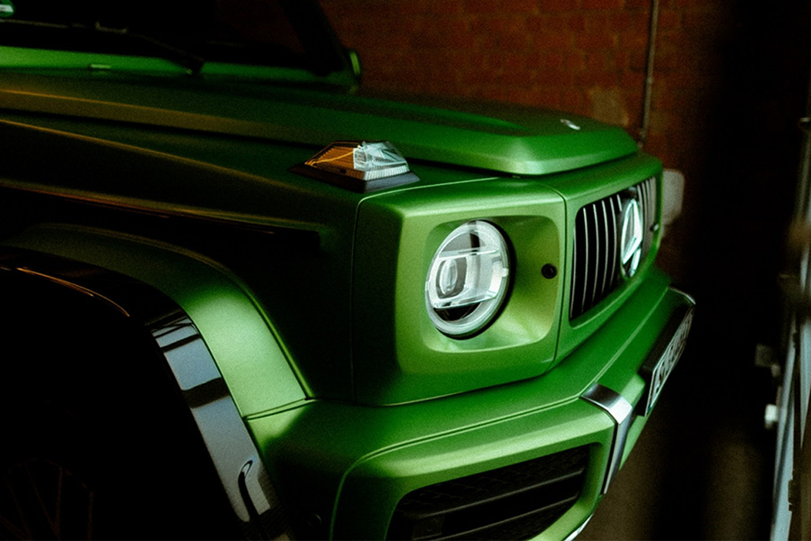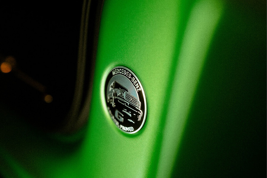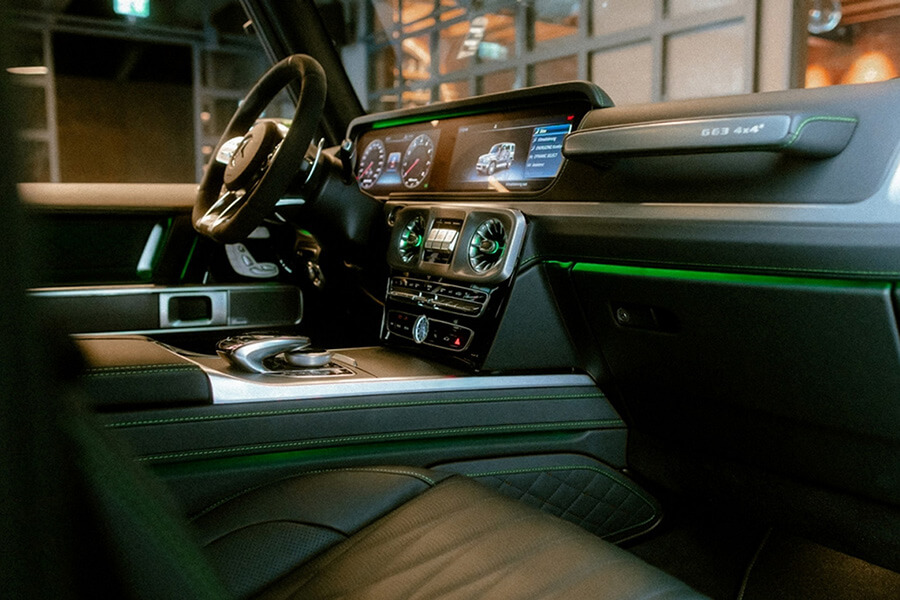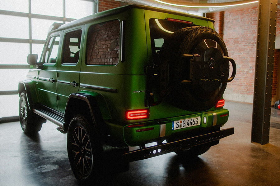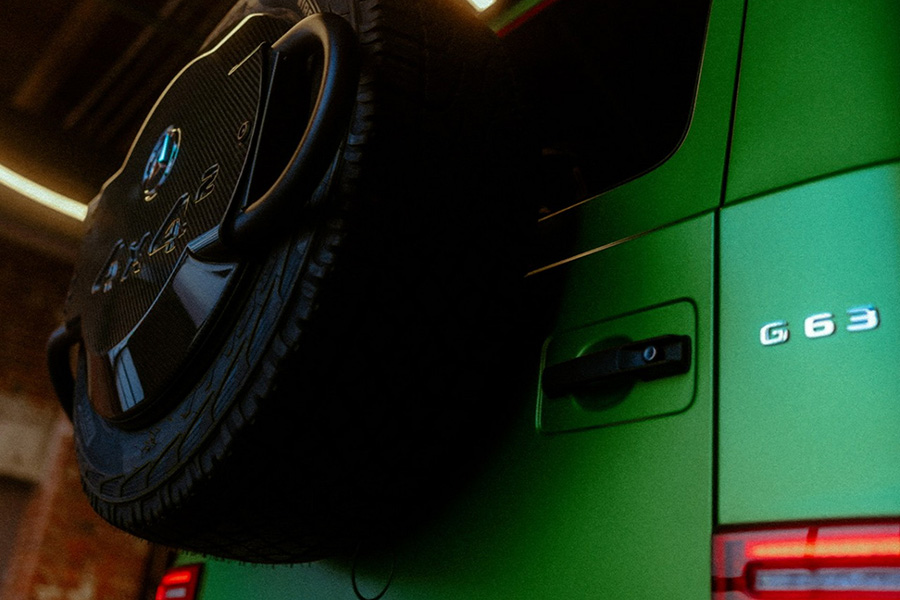 賓士在其G-Class私人網站中發布這組照片,可以看到此車已裝上寬輪拱、22吋胎圈、車頂LED燈,在消光綠的塗裝之上有著大量碳纖維部件綴飾,包含在車尾那超大片的備胎蓋。車內除了有更多碳纖維鋪陳外,還有大型螢幕構成的數位儀表、氣氛燈、電子後視鏡已及皮革包覆的運動坐椅及方向盤。