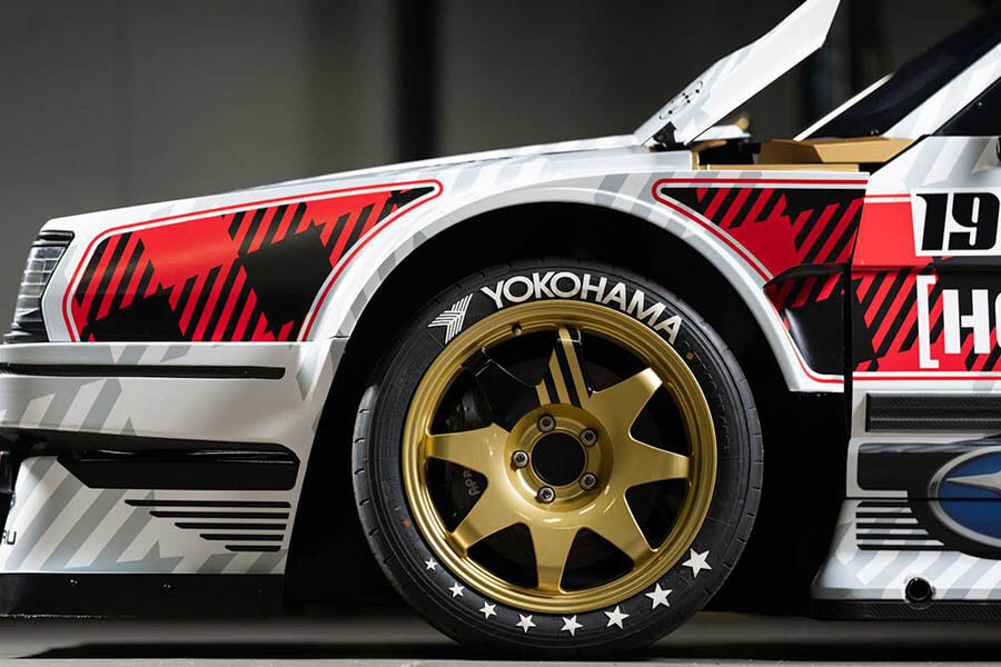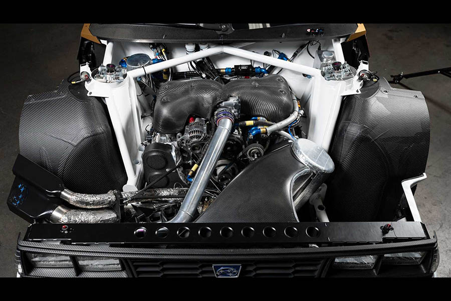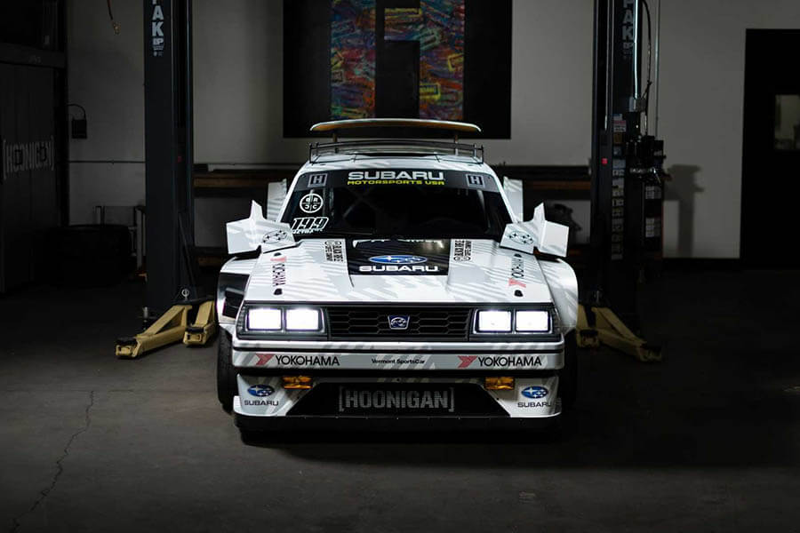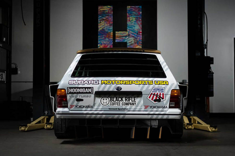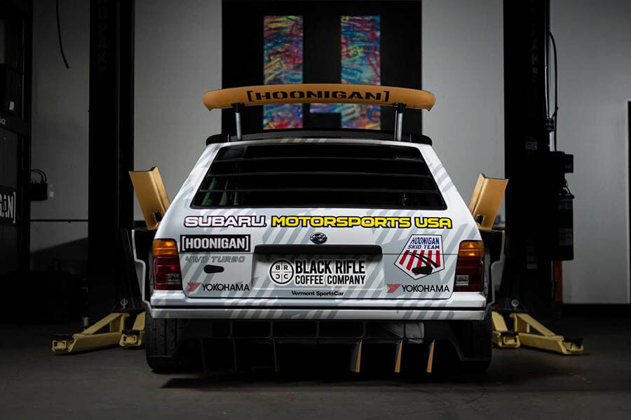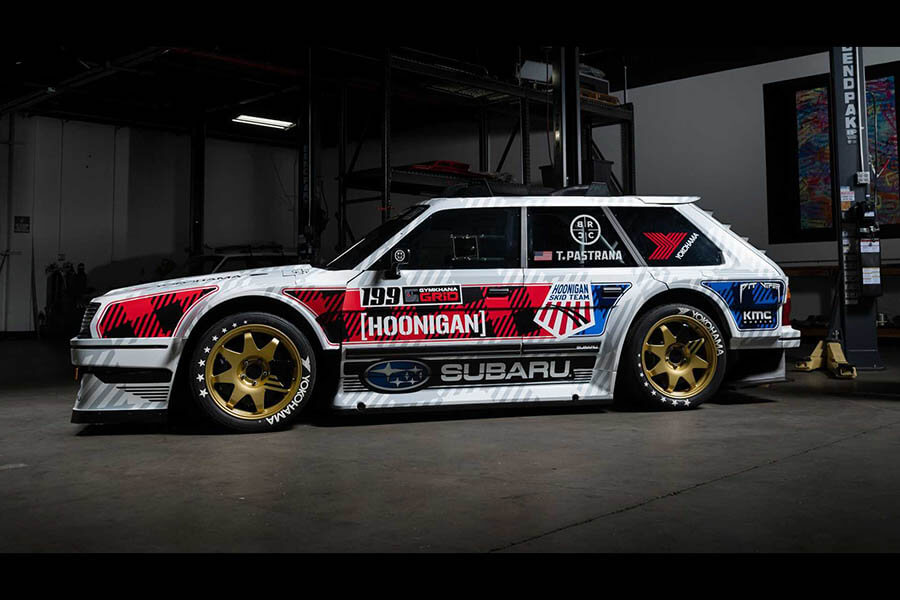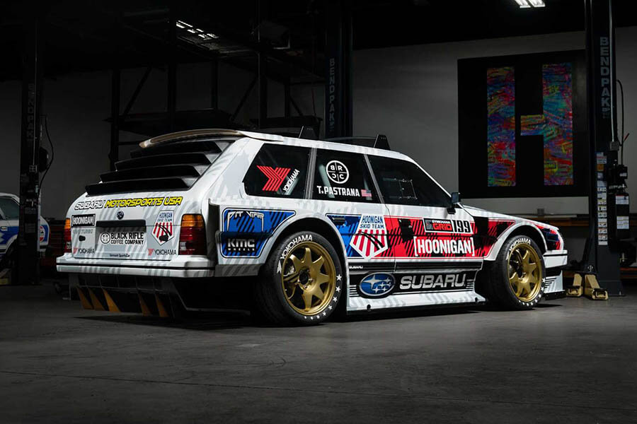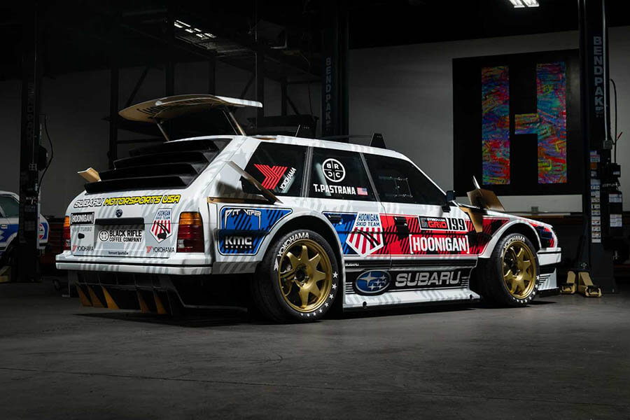 這部Subaru旅行車被命名為”Family Huckster”(家庭推銷員),可見Hoonigan裏頭的這群傢伙肯定覺得開這部身懷862匹馬力的車每天在校門口接送小孩上下學、或是在周末進行一趟溫馨的家庭旅行是個恰如其分的不二之選。引擎蓋下依然是Subaru招牌的水平對臥四缸引擎,搭配上六速序列式變速箱及AWD全輪驅動系統,至於更詳細的改裝尚不得而知。而早已改採碳纖維材質的車身外殼則覆於鋼管車架之上。在WRC規格的長行程懸吊之下所安裝的是由KMC為此車量身打造的鍛造輪框,在具備輕巧耐用的特性下,同時其八幅造型也以1980年代GL Wagon的輪框做參考。