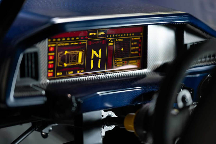 在內裝部分則呈現了1980年代的復古情懷,除了採用藍色碳纖維建構情懷十足的儀表外型,更安裝了一具正宗的1983 GL Wagon收音機於其上;12吋的大型數位儀表則以復古未來風格的黃色液晶呈現。