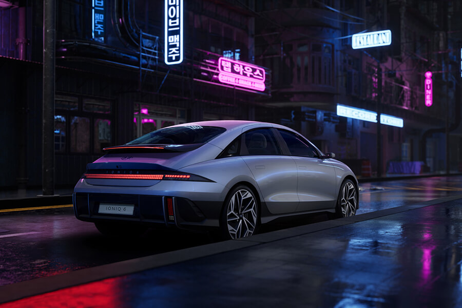 早在發表前Hyundai便揭露此車”electrified streamliner”(電動化流線)的設計概念,反映在Ioniq 6的車身外觀上看來所言不虛:呈現拱形的車頂輪廓及側車窗下緣線條強化了外觀光滑圓潤的視覺,流暢平順得引擎蓋上也兩道隆起,一直延伸至A柱下方。同時可以看到後視鏡已改為外置鏡頭的電子後視鏡。車輛頭尾的設計帶有一些緣自自家MPV:Staria的神韻,搭配貫穿車尾的橫跨式尾燈以及埋藏其中的像素式燈組帶來一些復古未來風格;在短翹車尾上方則還有一具與車身合而為一的尾翼,並結合第三煞車燈。覺得酷嗎?不僅止於酷,Ioniq 6的流暢外型還使風阻係數僅有0.21。追求水滴般的低風阻外型曾經僅止於科幻小說領域,不過在今日的電動車上顯然對於提升續航里程有所幫助。