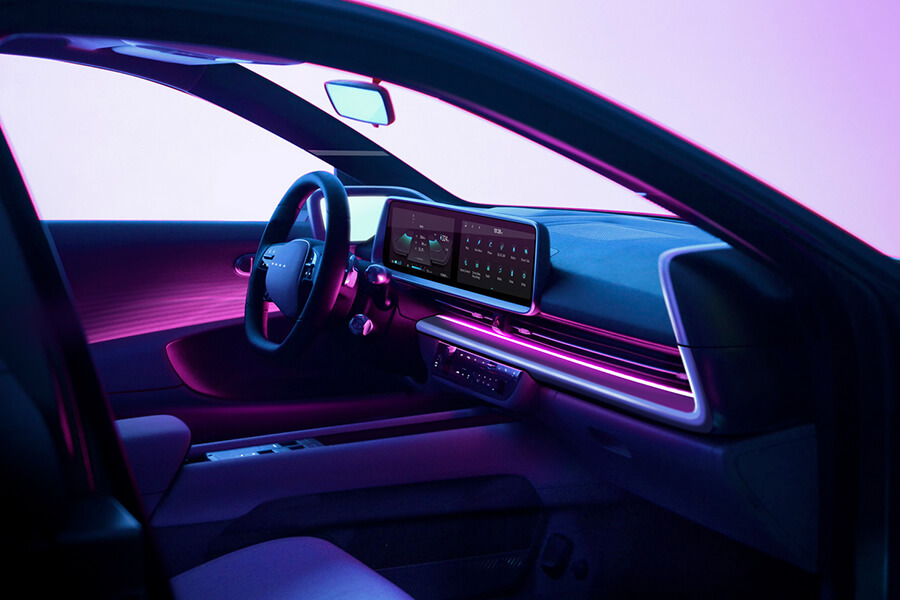 在車輛內部,Ioniq 6與Ioniq 5採取相當類似的呈現手法,以兩具12吋螢幕構成儀表以及多媒體資訊娛樂系統的顯示器,同時帶有64色氣氛燈的中控台兩側猛地向上拉升,構成電子後視鏡的顯示螢幕。