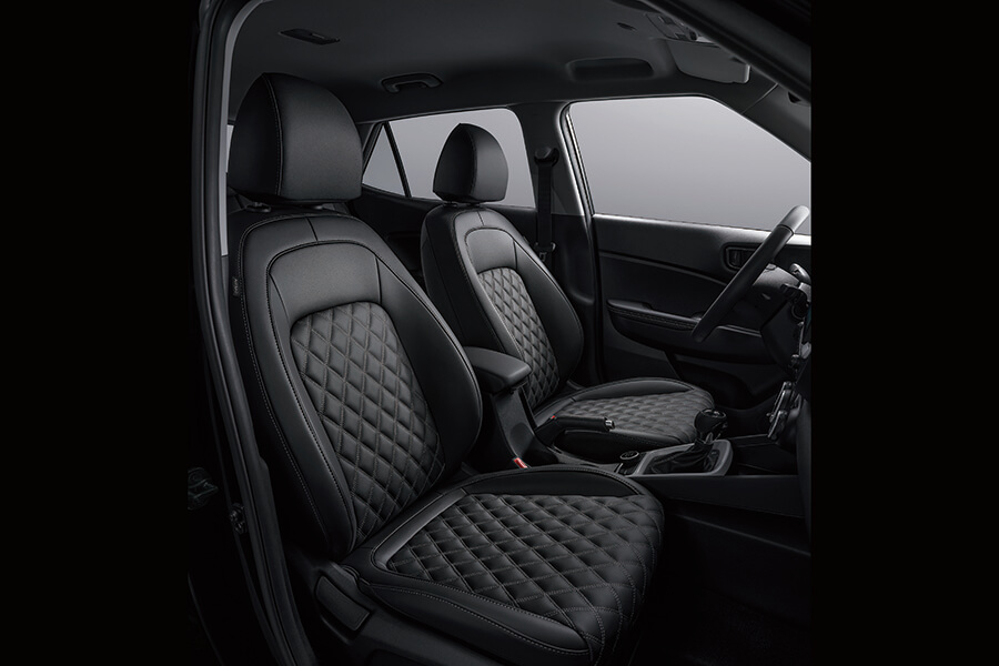 HYUNDAI VENUE外觀主調採黑晶亮車色搭配白色的細節點綴、搭配專屬BW飾徽與極黑雙色切削鋁圈,一口氣體現品味與搶眼,並在內裝新植入經典菱格紋皮質座椅與個性風金屬踏板,黑白色控發燒友這下可有福了。