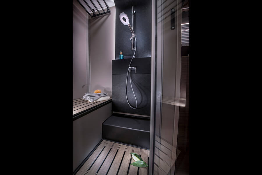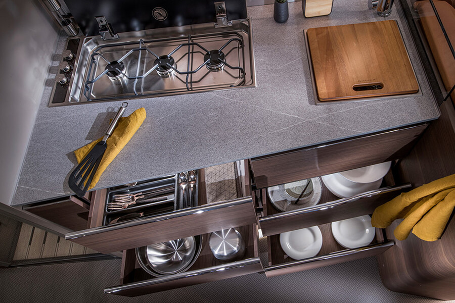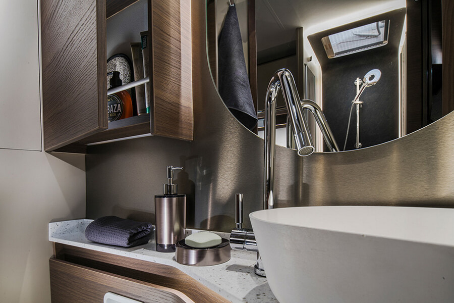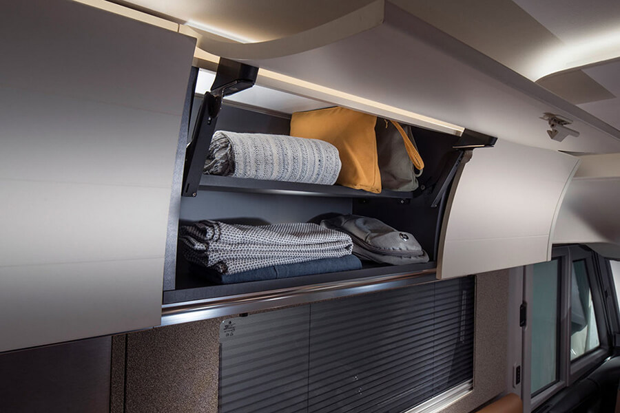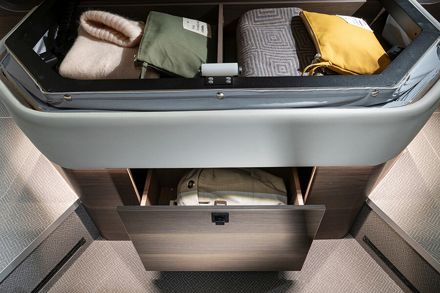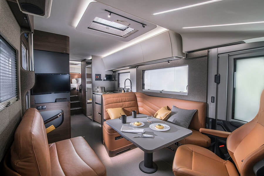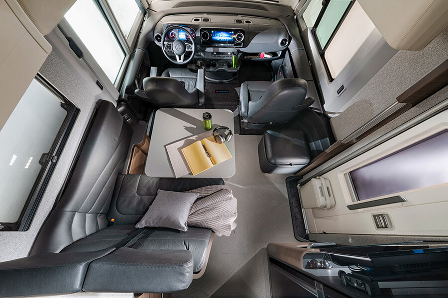 其餘部分包括沿用Sprinter的儀表、依舊配備MBUX多媒體資訊娛樂系統等,正副駕駛的座椅則由Aguti設計並改造為可向後旋轉的樣式,同時雙層地板具備隔熱及置物功能,此外還有150L大水箱、全車室內環境照明、電子後視鏡及手機App遠端控制功能。
