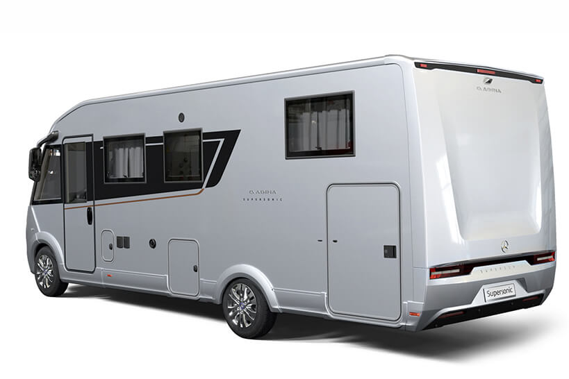 Adria Supersonic被歸類為所謂”A-Class motorhome”(A級房車),指稱以LCV輕型商用車底盤為基礎、再將訂製車身建構其上的車款。在乾淨簡潔的線條輪廓下,Adria Supersonic有著大面積擋風玻璃、與巴士相仿的大面積後照鏡、融入前格柵造型的LED燈組以及依舊帶有十足美感的尾燈造型,甚至在底部有著梯形擴散器的外觀點綴。