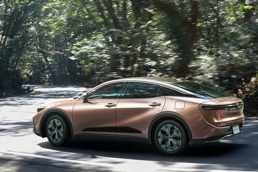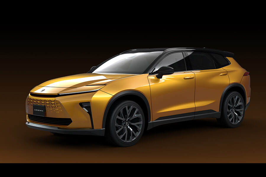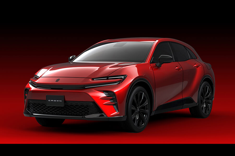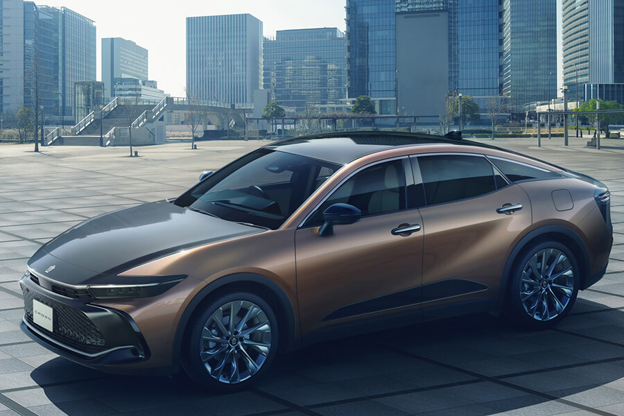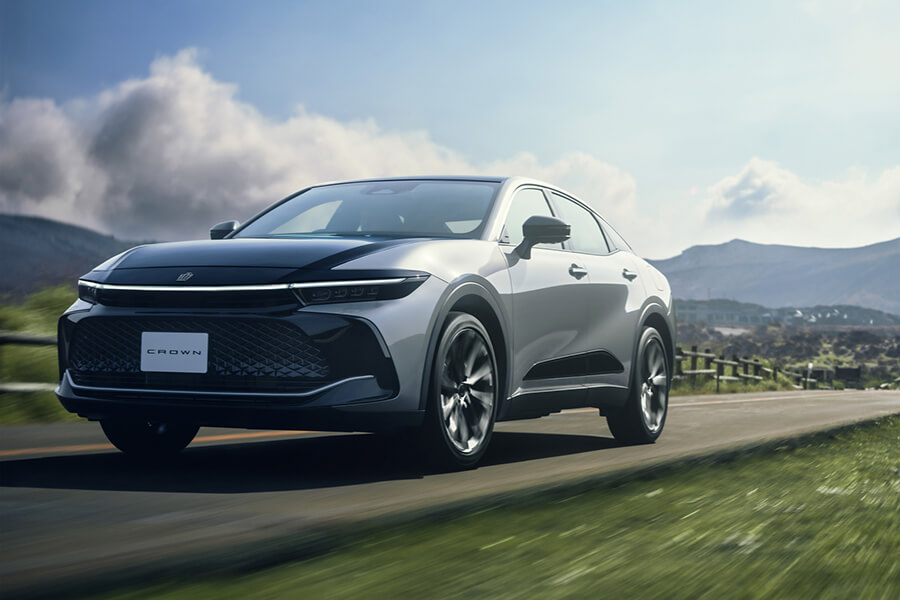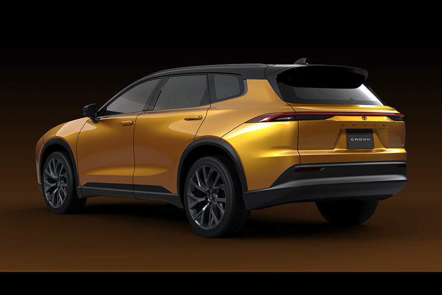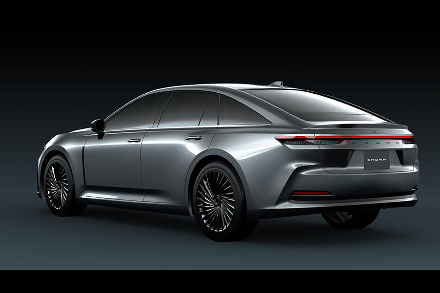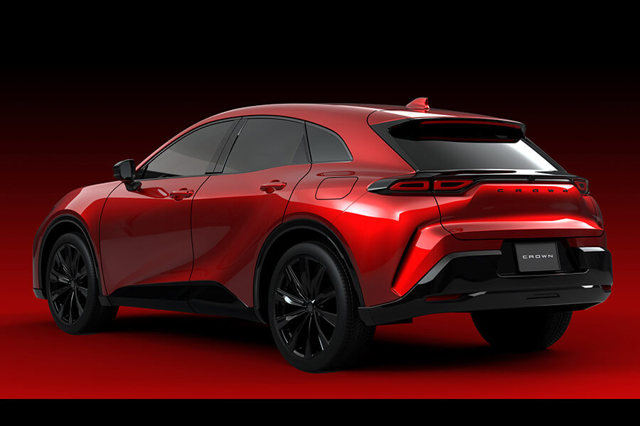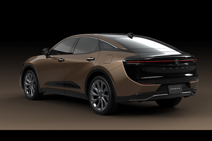 在外觀設計方面新一代Crown具備雙門轎跑般流暢的線條、結合力量感的曲線造型,頭尾燈組皆採橫跨式造型設計,並破格採用了大尺寸胎圈匹配創新的車身結構,形塑出介於轎車與SUV之間獨特的視覺穩重感。