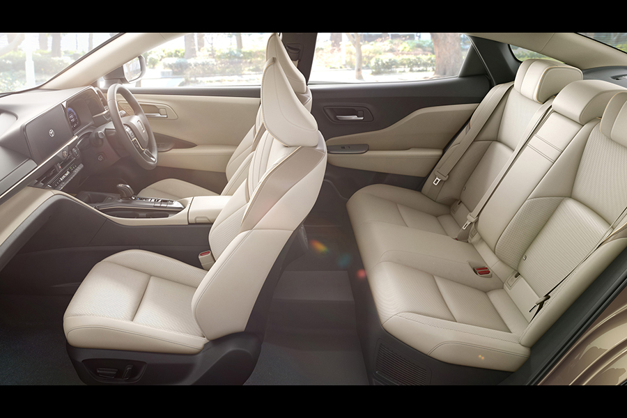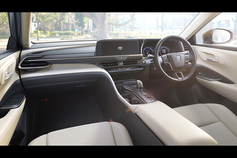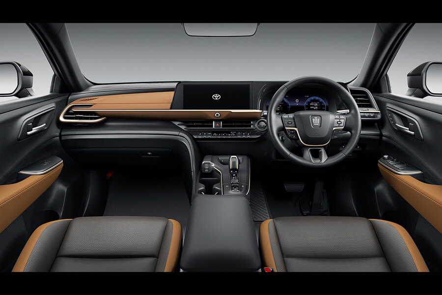 車輛內裝採取12.3吋數位儀表及同為12.3吋的多媒體資訊系統,結合導航、無限更新以及” Hey, Toyota”喚醒詞的智慧語音助手。入門級的Crown XLE便配備加熱前排座椅、八向電動調節以及織材混合Softex皮革內飾,其中並包含雙區恆溫空調、無限手機充電器和六揚聲器音響等。更高一級的Crown Limited具備加熱/通風皮革前排座椅,以及具加熱功能的後排座椅。其他配備包括感應雨刷、全景玻璃車頂和 11具揚聲器的JBL 高級音響系統;最高等級的Platinum白金版則配備主動式懸吊、帶有黑色裝飾的21吋輪圈及高階停車輔助系統等。