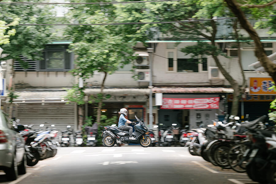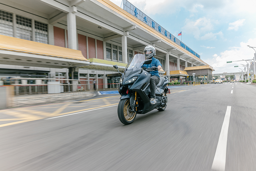在發動上路之後還能找到更多新一代TMAX改變的細節,包含從駕駛者視角看去可發現車頭體積變小了,騎乘起來的心態也顯得相對輕鬆;在輸出的反應上,這一代TMAX明顯在輸出特性上下過功夫,轉下油門、動力湧現的瞬間力道堅決而肯定、卻仍不到使騎士感到暴衝感的特性,將力道控制得相當好;與上代相同的T、S雙駕駛模式亦有顯著分野,相對輸出線性堆疊的T模式,S模式下彷彿車子也知道你想調皮一下,右手一轉轉速便直奔扭力峰值5250rpm,相繼而來的推力與動力延伸仍源源不覺地帶領人車向前衝刺。除卻直線加速之外,過彎操控表現也同樣值得讚揚,彈簧與阻尼的軟硬雖然對休旅騎乘來說略顯硬朗,對於流暢地運動操駕來說卻顯得恰到好處,支撐性與阻尼強度十足的同時又不失吸震能力的表現讓我直接聯想到同品牌YZF-R7也具備的類似調性。在駛入多彎的環境下,拜上述騎乘三角、懸吊設定以及首度取採旋壓鑄造工法的輕量化輪圈所帶來有感的簧下重量減輕,入彎無須挪移身體或刻意推動把手抵抗離心力,僅需扣下煞車、輕帶重心,再度釋放煞車拉桿時便是輕舟已過萬重山。
