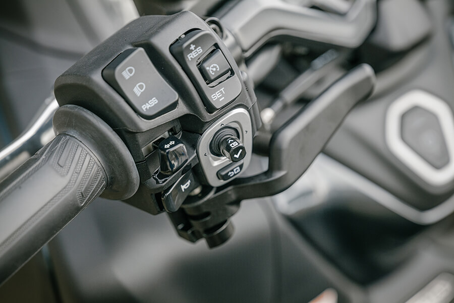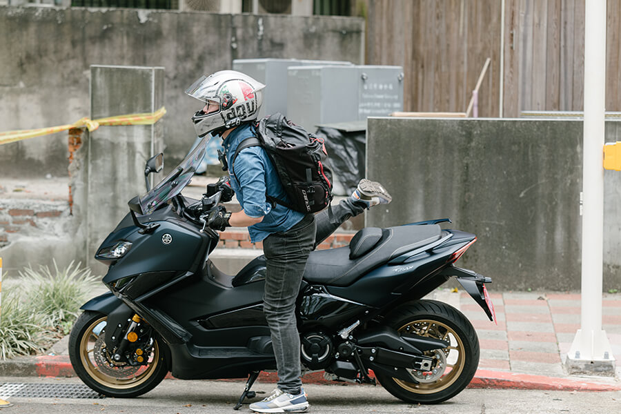 坐上新一代TMAX 560之後所帶來的感覺與筆者過去自TMAX 530以來的乘坐感截然不同。首先是採金屬一體成形的外露把手不僅位置前移,角度也略略下斜,抓握起來有點像跑車分離把那樣,能以靠近小指的掌緣輕鬆握持,加上騎乘三角設定使騎士的上肢更加前傾一些,帶來更具運動氛圍的感受,即便只是單純坐在車上、尚未發動引擎就能體察。