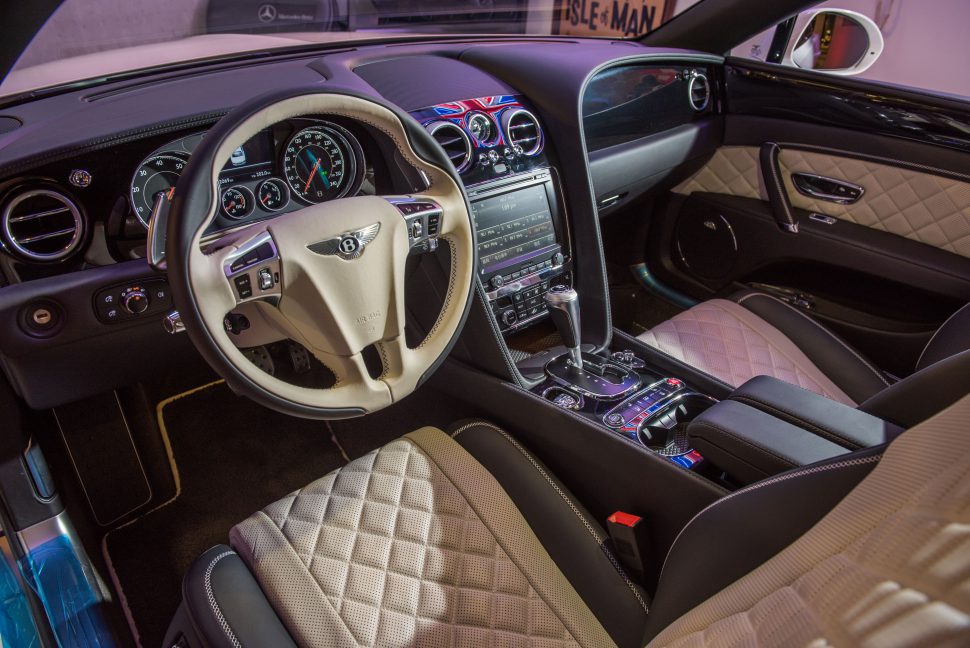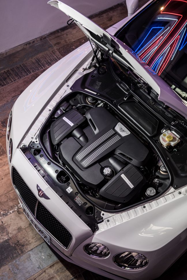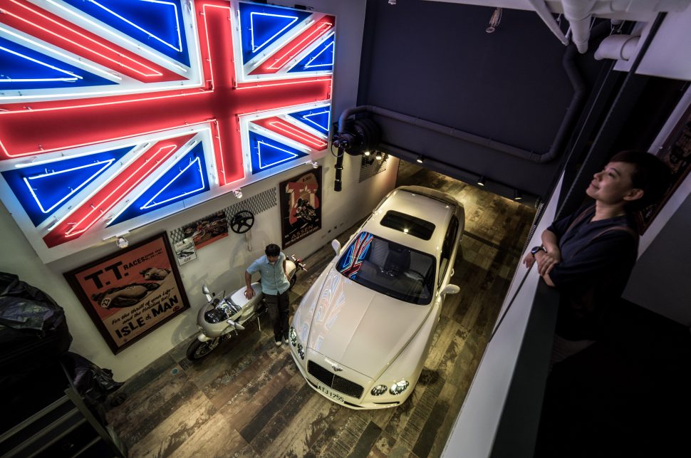 原先只是想拍個豪宅配豪車的畫面,沒想到這位偶像朋友的車庫牆上居然掛了組大大的英國旗霓虹燈,莫非這意謂著什麼?我不想給他太大的壓力,照片拍完請洽賓利微微,車就留下賀成交。以上純屬玩笑話,正事可不能忘,賓利本來就非常注重細節,外型看似保守,但一些小地方如前保桿進氣口的機翼線條,前葉子板的氣孔都用盡心機,這些設計可增加下壓力並提高散熱效能,而後車門末端開始上揚的肌肉線條也顯露設計師想傳達的意念。煞車系統雖未用上碳纖維製品,不過前雙活塞大卡鉗(後單活塞),配上直徑405mm煞車碟盤(後335mm),真一腳下去也是游刃有餘。其他如選配的米勒套件21吋6幅雙肋輪圈配上低扁平比跑胎,還有主動控制的避震器也是最新貨色。