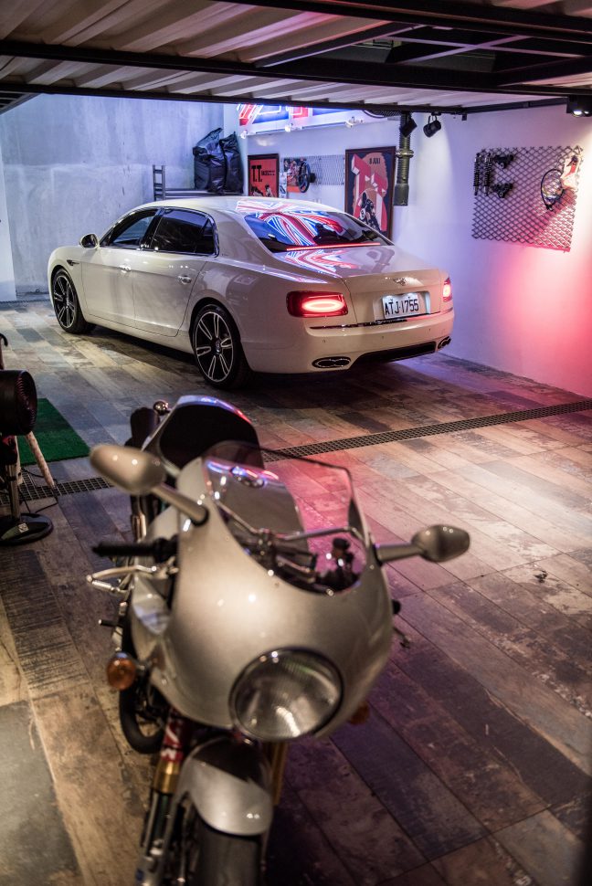 綠燈一亮大開油門,V8渦輪引擎隨著轉速錶指針一過3000rpm開始傳來一陣含蓄的嘶嘯聲,快又急但不至於讓你目瞪口呆,八速手自排變速箱讓動力傳輸以非常高的效率運作著,車雖快但還不至於讓郵輪魂上了它的身,畢竟賓利雖定位是豪車,但其實仍定位為自駕車款,相當注重下盤的穩定與路感。確實不簡單,比S-Class還要大的尺碼卻能造就從容的駕馭環境,只可惜在台北市區,V8雙渦輪的528匹馬力難有用武之地,每次畜足勁即將發功總有狀況出現,找不到機會可以體驗最精彩的動力高原。當然我可以用手排撥片讓變速箱在二、三檔間排迴,刻意將轉速逼入6000rpm紅區,但這有失我做為賓利哥的紳士風範,畢竟後頭還有微微及雪瑞等兩位女士,我不想讓人留下這司機開車技術有待加強的說嘴機會,借終極殺陣的橋段一用替後頭兩位女士準備嘔吐袋?才想到這裡就已經到了約定拍照的地點, 一個偶像朋友的車庫,飾演賓利哥的本人終於放下心中大石。