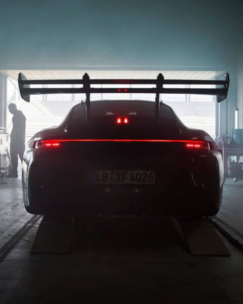 從車頭的擴散槽,各位大概可以感受到新車有多重視空力效果,車尾的GT尾翼看來也將成為車系有史以來面積最大,而且功能最多的。雖然原廠釋放出的圖片不多,但也在品牌的社群平台額外放上了不少較為局部的圖片,就可以看到這隻尾翼除了固定式可調機能外,還會加上DRS減阻系統,讓這部量產車的空力效應有機會達到與911RSR相近的水準。而廠方也刻意只放上車頭角度居多的圖片,但按照網路上大量流傳的測試影片,新車從車尾45度角看去更是讓人感到驚奇。