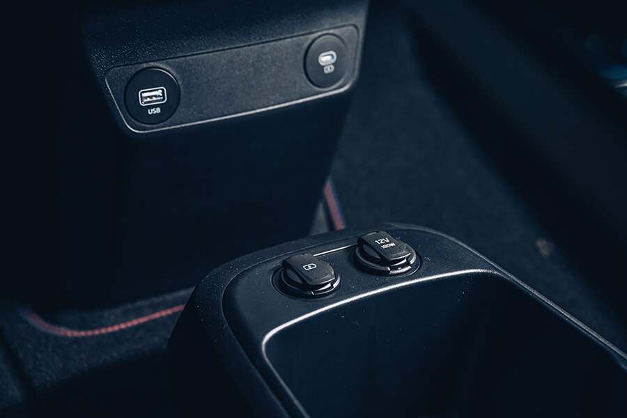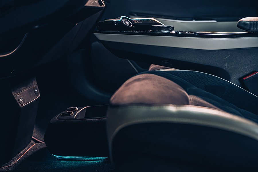 聊到內裝,我的想法與外型基本上一樣,也是帶有幾分新潮,但又還是希望保留傳統感受,同時內裝用料的鋪陳也是很有個性化設計感的安排。例如你看到控台或是大型鞍部上的壓花、拉絲縫線或是多彩氣氛燈的編排都很有時尚設計感,座椅也有一些特別造型。另外就是環艙式的控台還有曲面雙12.3螢幕,各種安排都融入了不少高級品牌的手法,讓人覺得車艙的設計語言非常強烈,很有特別風格,但我反而覺得稍微可惜的是EV6沒能發揮新世代電動車在空間編排上的優勢,特別是那個艦艇甲板式的懸浮固定鞍部,造型與個性感非常強烈,但使用機能就顯得普通了點,例如提供無線充電,但依然只能使用插線式的手機連線方式,也就只能把手機放在下方空間,在整個使用習慣來說有些設計與機能上互相遷就的模稜兩可感,這也是不少我們現在要用傳統油車來稱呼的車款就常有的問題,但那套雙模式可切換的音響與空調介面非常討喜也實用,讓我很希望能拆去另一台車上用,下方大儲物空間也有提供多個電源供應或點菸器供電孔,至於後座想幫手機充電的話,插孔在前座椅背側面喔。