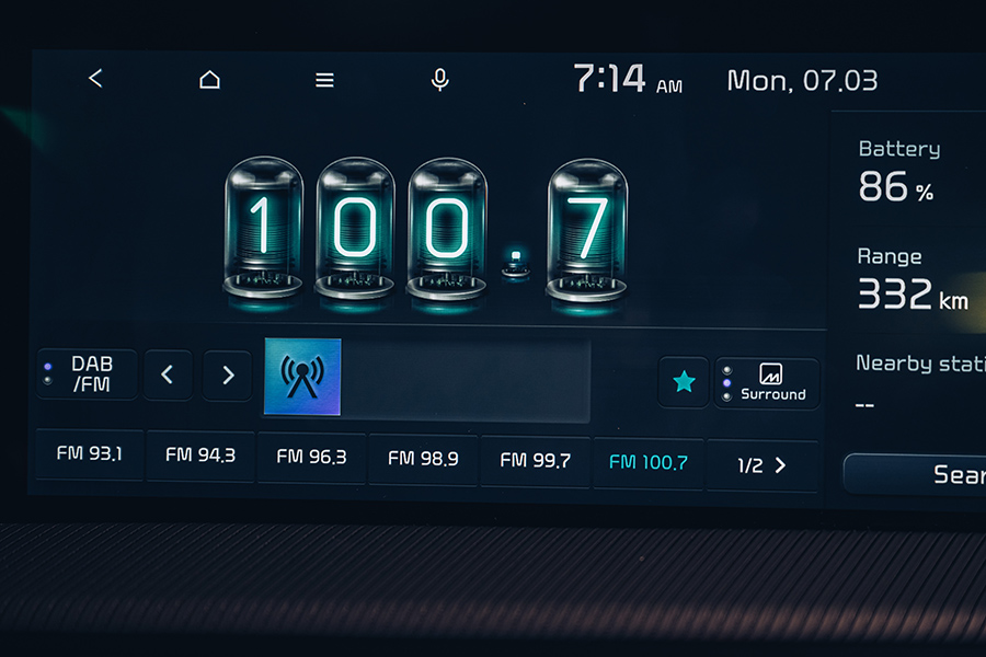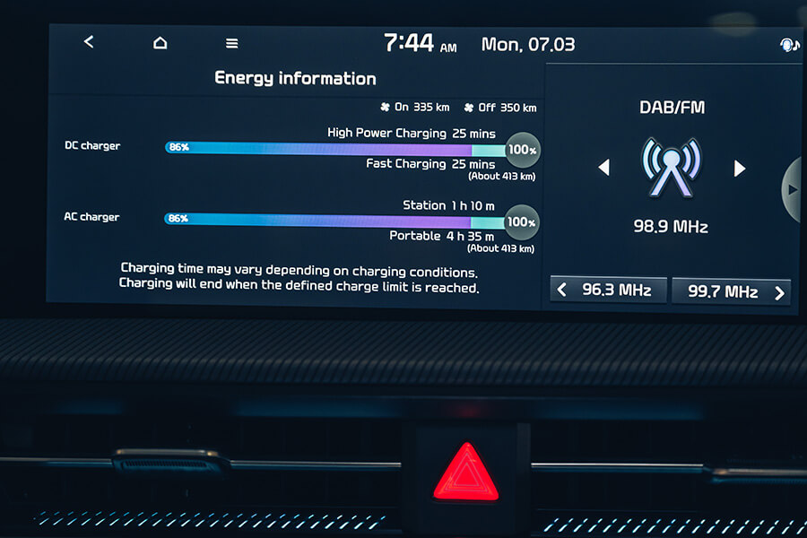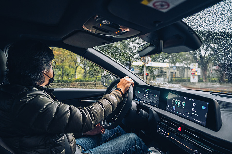 至於開起來甚麼感覺,可能是先前我們試駕的電動車大多強調高輸出高動力,因此除了電池之外,馬達本身的重量也帶給前後車軸很大的負載。EV6兩百出頭匹的一般動力設定,讓我在一整天的駕駛過程中,都不會有底盤特別沉重的感覺,而且它也並非擁有甚麼先進主動阻尼或氣壓避震機制能做出補償,就能讓車身在行進間保持沉穩的底盤質感,經過橋接縫、起伏路況或是減速坡,避震器的運作回饋都是保持很好的支撐感,並少有下盤重量或是大號胎圈帶來的碎震彈跳。因此開起來的舒適感與車身紮實度非常討人喜歡,而車頭在沒有太多負重的需求下,指向的反應算是非常快速,而且在試車當日大暴雨的狀態下,EV6整部車就還是給人非常老老實實的壓在路面上,讓我想起早先在Stinger上體會到的那種正宗歐洲車硬派厚重感,會讓駕駛人感到安定感十足,不錯的隔音能力也讓路面水花聲壓制在不惱人的程度,我還可以在車內連番更換ASD聲浪模擬系統的不同音效風格,而且這套系統還可以針對音效的聲量大小、頻率快慢以及音質強緩等細部做出一些調整,光是這個功能我想就可以讓車主在充電時打發不少時間。