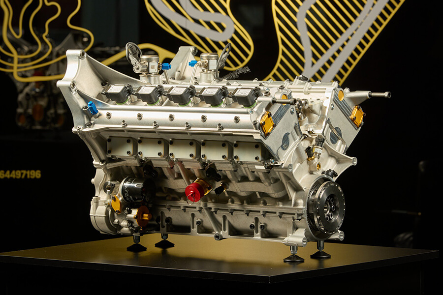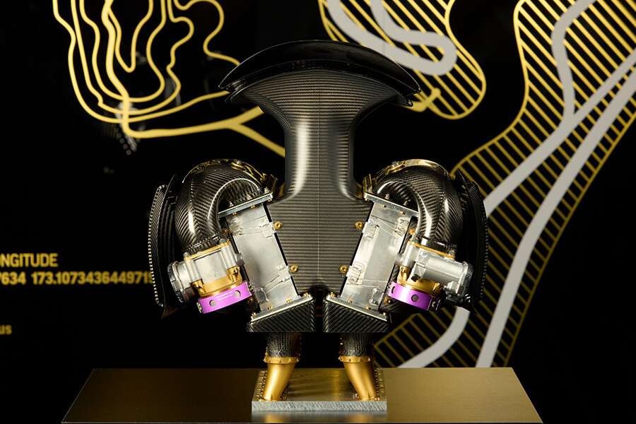 為這部碳纖維蝙蝠車提供動力的,是一具由Rodin與Neil Brown Engineering所合作製造有史以來最清、結構最緊湊的4.0雙渦輪增壓V10引擎,這具僅重132公斤的引擎在額外具有174hp的電動機推波助瀾下,具備1159hp的綜效馬力及104kgm的最大扭力。在引擎轉速具備直指10,000rpm能力的同時,採用鈦材質3D列印方式打造的八速變速箱亦僅重66公斤。