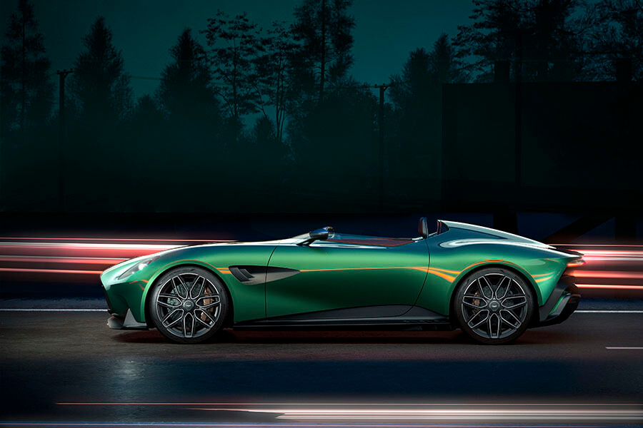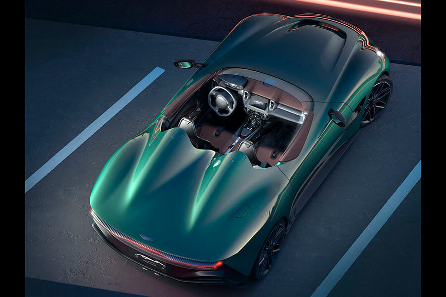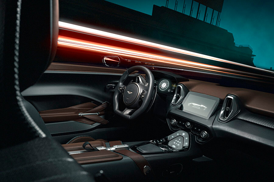 在長車頭最前端的標誌性馬蹄形進氣口帶有碳纖維材質嵌件,為引擎蓋下的V12引擎帶來新鮮空氣;車尾以橫亙左右的尾燈組搭配遍佈細小穿孔的車尾表面,下方則具備擴散器及中央排氣管出口。胎圈部分採用21吋的14輻輪圈,並以柔軟且芳香的皮革輔以高性能碳纖維座椅鋪陳乘坐空間。