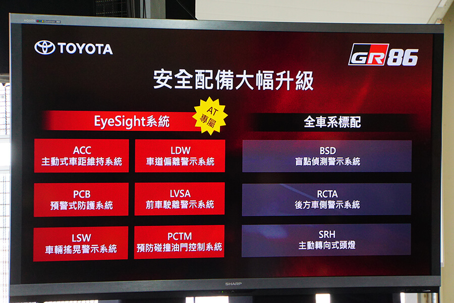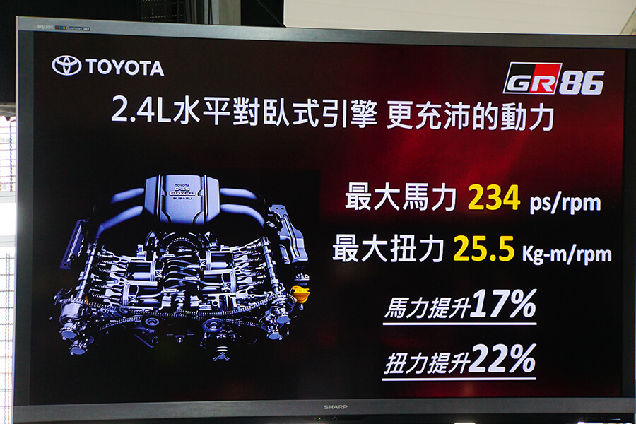 TOYOTA總代理和泰汽車於2022年8月18日假台中麗寶國際賽車場舉辦全新TOYOTA GR86上市發表會。TOYOTA 86自2012年正式導入台灣市場以來,引爆國內消費者對小型跑車的熱潮,累積銷售至今已突破2千台,今年更迎來10年一度的大改款,融合GAZOO Racing賽道血統,以GR86之姿正式登場。GR86不僅升級為2.4升水平對臥引擎,更同步販售手排與自排雙車型。