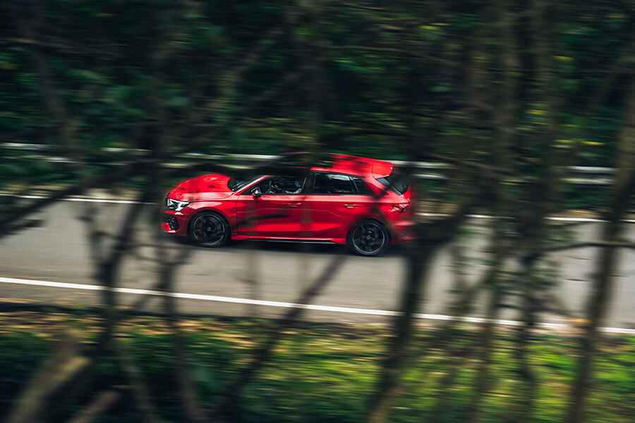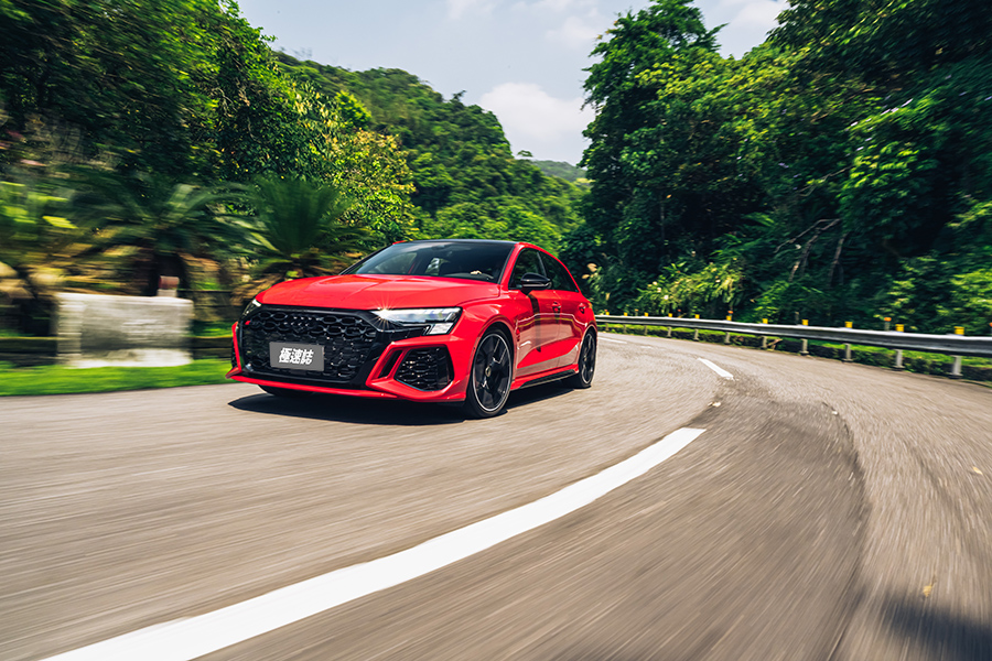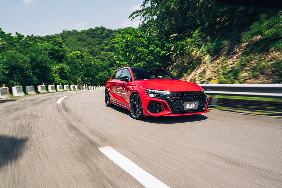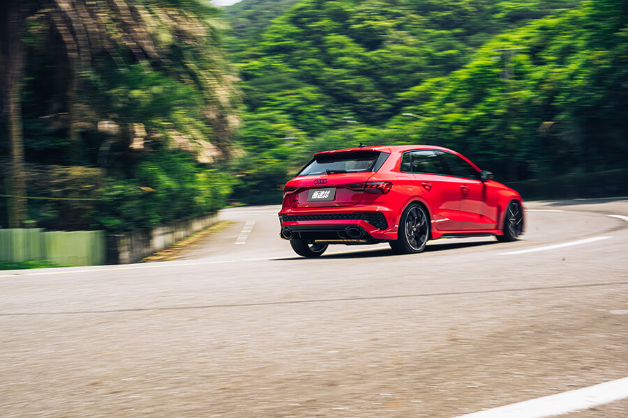 開著RS 3在山路裡的動態反應非常有趣,一開始互相熟悉一下對方時,它的動態回應很有一台標準四驅車的風味,略偏四平八穩並帶有些微推頭特性。Dynamic模式下的硬派底盤特性也讓人很有老派性能掀背車的風味。但隨著更熟悉它的身手之後,開始更進一步來驅策它,並把行車模式切上RS模式,這時候的動態回應開始變得有點不同,而當進彎煞車越來越晚,補油的動作越來越大時,整個操駕反應彷彿活了過來,後輪在新的多片離合器式差速器的分配動力下,讓車尾擺動極為靈敏,但又能把擺動幅度控制的恰到好處,可以好好善用前寬胎提供的抓地力咬進彎心,後輪隨即補上推動出彎,加速出彎車尾總是腰馬一沉的後驅特性非常強烈。而且最令人感到熱血度激增的是這套底盤不僅極限頗高,而且很能隨著駕駛的意志起舞,可以用上很多種的衝刺手法來挑戰彎道,越用力開,它也越用力地回應你的操駕動作,這點可是以往奧迪少有的動態特性,不會像過去一碰到限制範圍就大舉收兵以策安全,保留了更多的揮灑空間,但駕駛可以保有高度對車輛的信心。這點我想也於維持那400匹的最大馬力有很大的關係,讓這些馬力能全力施展到柏油路上,不僅效率絕佳,更能帶來駕駛樂趣,而且有著高極限與寬容度的底盤,相當適合帶著它前往不同路線征戰一番,要是拓海故事重啟的話,就選它當作戰車了。