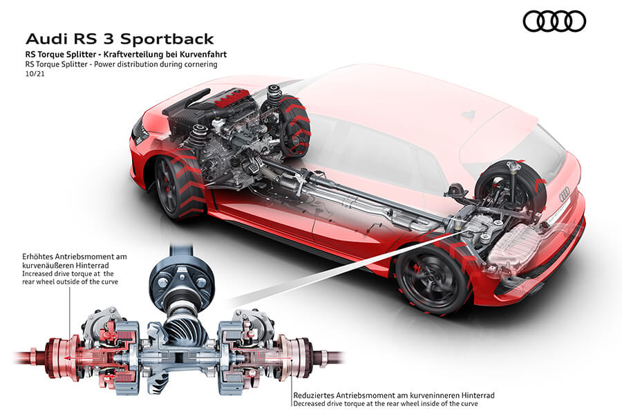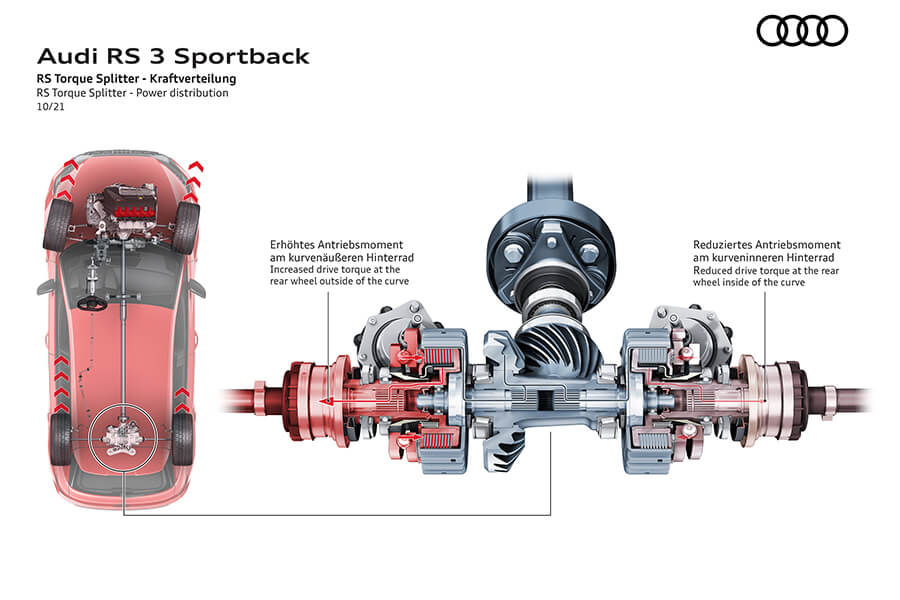 扭力分配絕對是近期性能車的必修課程,奧迪這回所用上的多片式離合器後軸差速系統,目的在於做出更主動的動力分送功能,可配合轉向直接進行後軸左右輪的動力分配工作,由電控系統整合讓車輛獲得非常中性的轉向反應並擁有更高的過彎極限,同時也設計出Torque rear的類純後驅狀態,透過動力可集中後軸甚至其中一輪,滿足四驅車也要華麗甩尾的動態英姿。