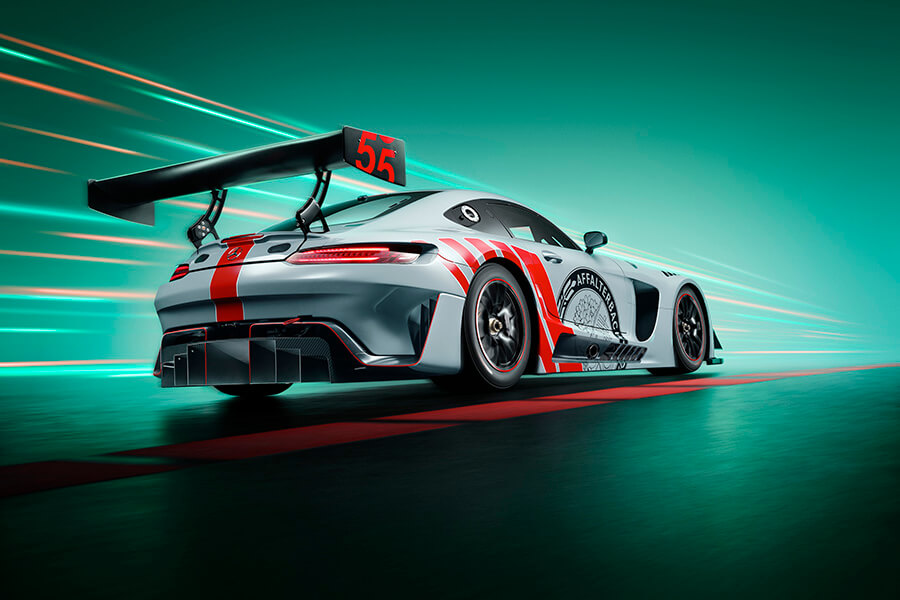 車輛外觀上AMG GT3 EDITION 55以高山灰底色加入紅色點綴,同時消光表面的碳纖維部件(前後擴散器、分流器、格柵、側裙、尾翼端板等)亦齊全傍身增加戰鬥氣息。Affalterbach 徽章亦大大印記在車門之上,尾翼兩端亦有紅色55周年標記字樣。