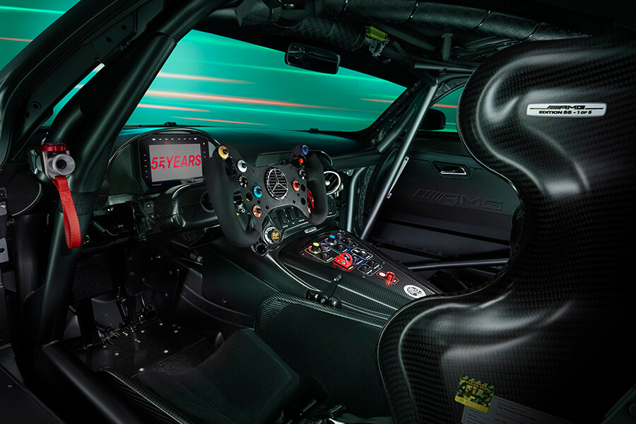 在車內空間中具備最新的數據顯示單元BOSCH11,高解析度顯示幕可呈現速度、引擎轉速、工作溫度、單圈時間、檔位、換檔提示以及其他資訊,開機動畫亦會顯示55周年紀念logo。除此之外在中控與探現為座椅上都可看到“EDITION 55 – 1 OF 5”字樣銘牌,內飾則以消光硬煤金屬色鋪陳,從門檻、門板、中控到儀表隨處可見;至於安全帶則具有銀色裝飾點綴。