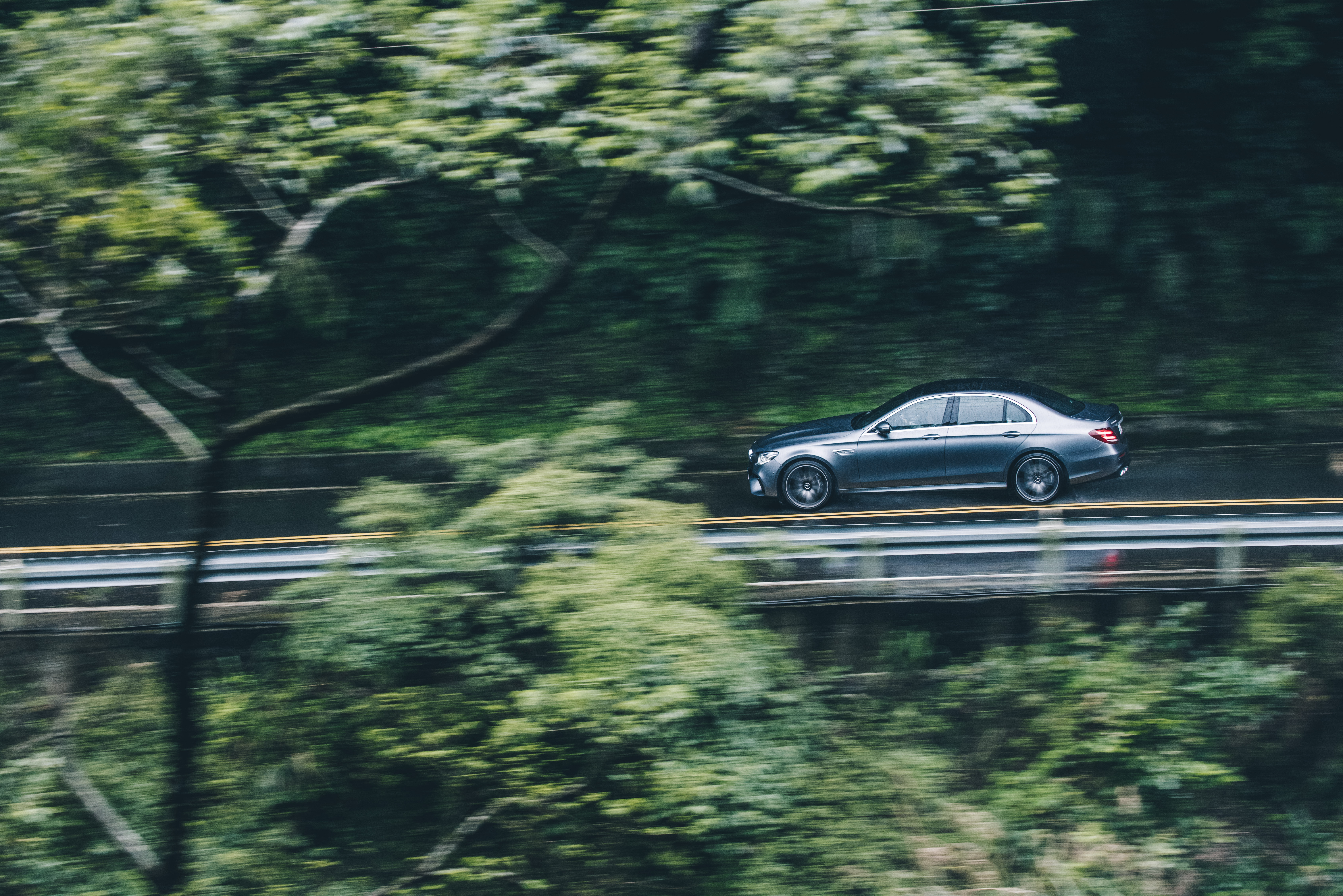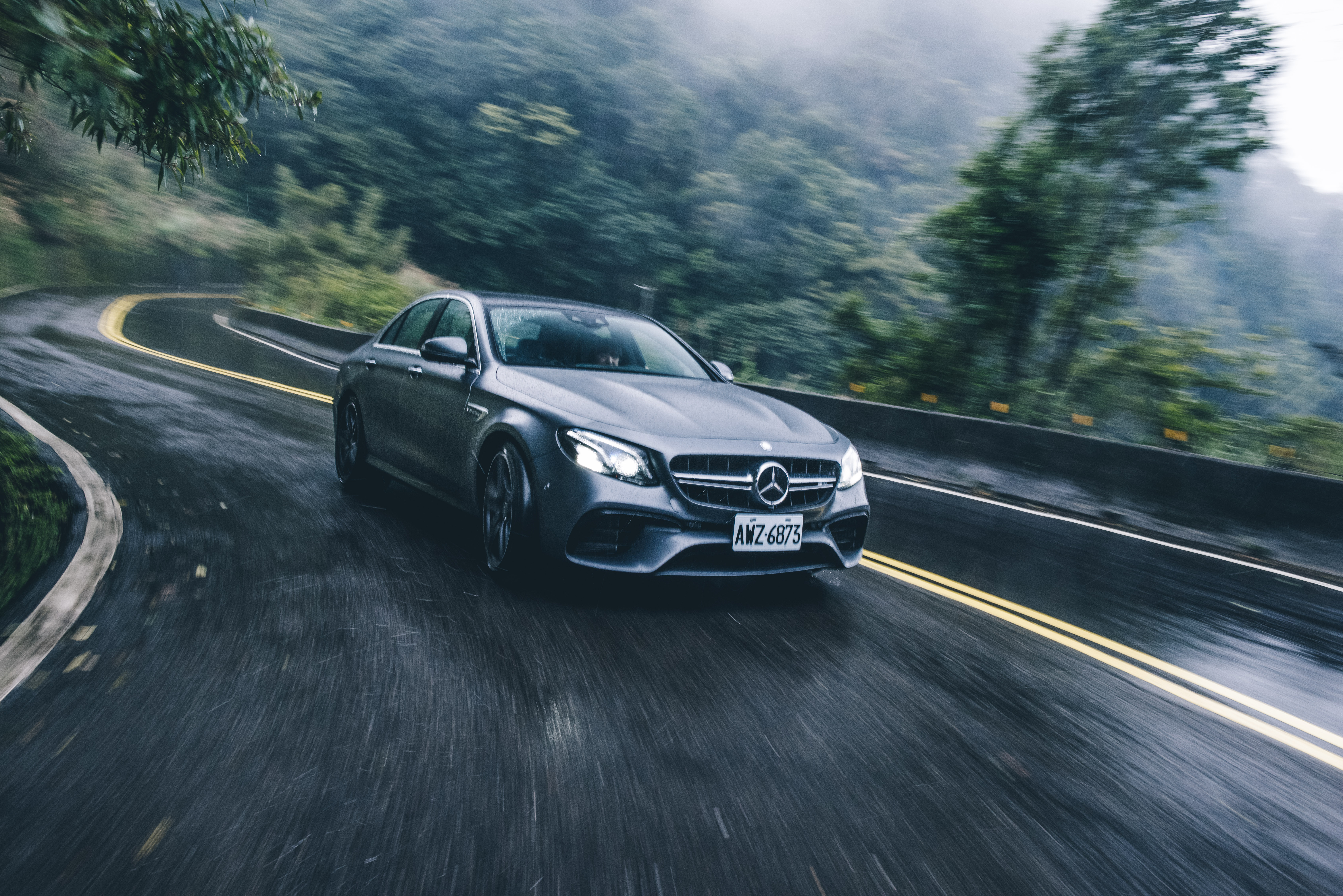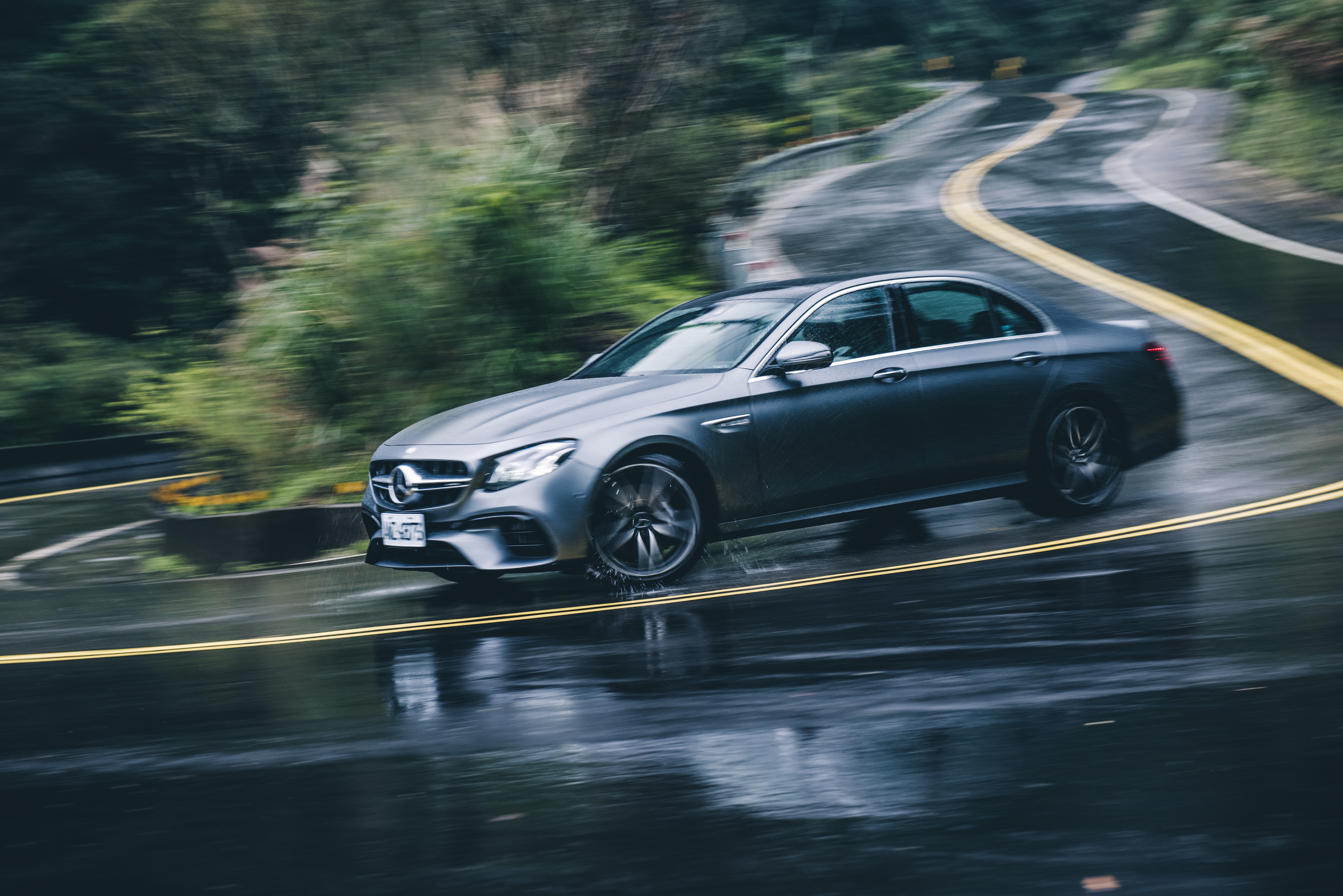 我對它的第一眼就有這種感受,上了車愈加肯定,只可惜受天候影響,讓E63 4Matic+有點施展不開。連綿不絕的雨勢將這條山路塗的又黑又亮,在這樣的情況下心裡相當矛盾,一方面畏懼於那暴力的571匹馬力,另一方面又希望4Matic能讓它可以無視天雨秀出曼妙舞姿,無奈站在雨中卻始終等不到羽婷。